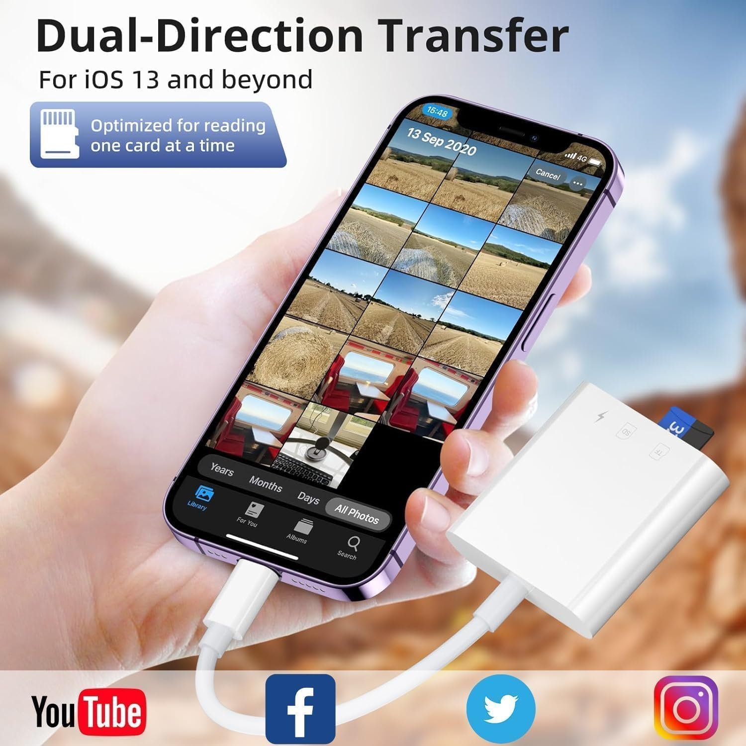 Wide Compatibility: The card reader is designed specifically for iOS, you can transfer and download photos, videos and files easily and quickly. Support a variety of SD cards for digital cameras, action cameras, drones, etc.(For iOS system, only support Phone version 9.2 or later, iPad version 8.0 or later, such as: Phone 14 13 12 11 Pro/Pro Max, iPad Pro, etc.)