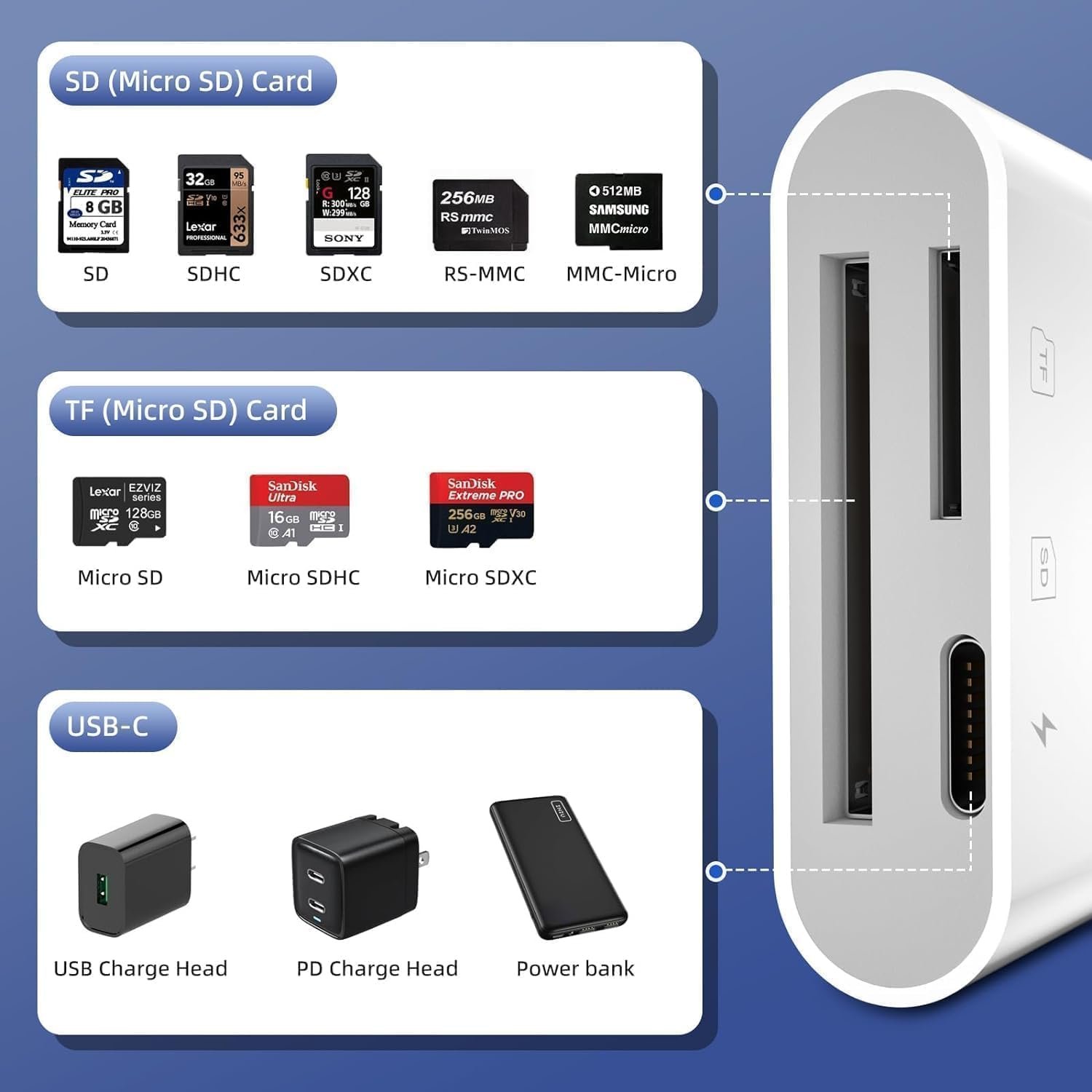 【Transfer Original Files】The sd card reader for phone is compatible with SD, SDHC, SDXC, MicroSD, MicroSDXC and MicroSDHC memory cards. This SD card supports standard photo formats, including JPEG, RAW, and 4K video formats, including H.264 and MPEG-4. As for SD card capacity, it supports up to 512GB