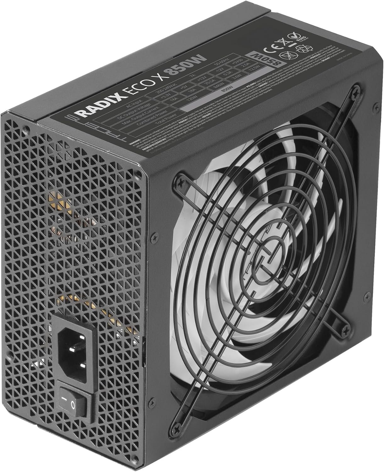 ABSOLUTE SILENCE. AI-RPM Y 140MM FDB: Equipped with the latest technology in AI-RPM fan control that ensures noise-free operation, the RADIX ECO X 850 power supply features intelligent thermal control and featuring an industrial-grade XL fan and 140mm dynamic fluid bearing and extra-large motor