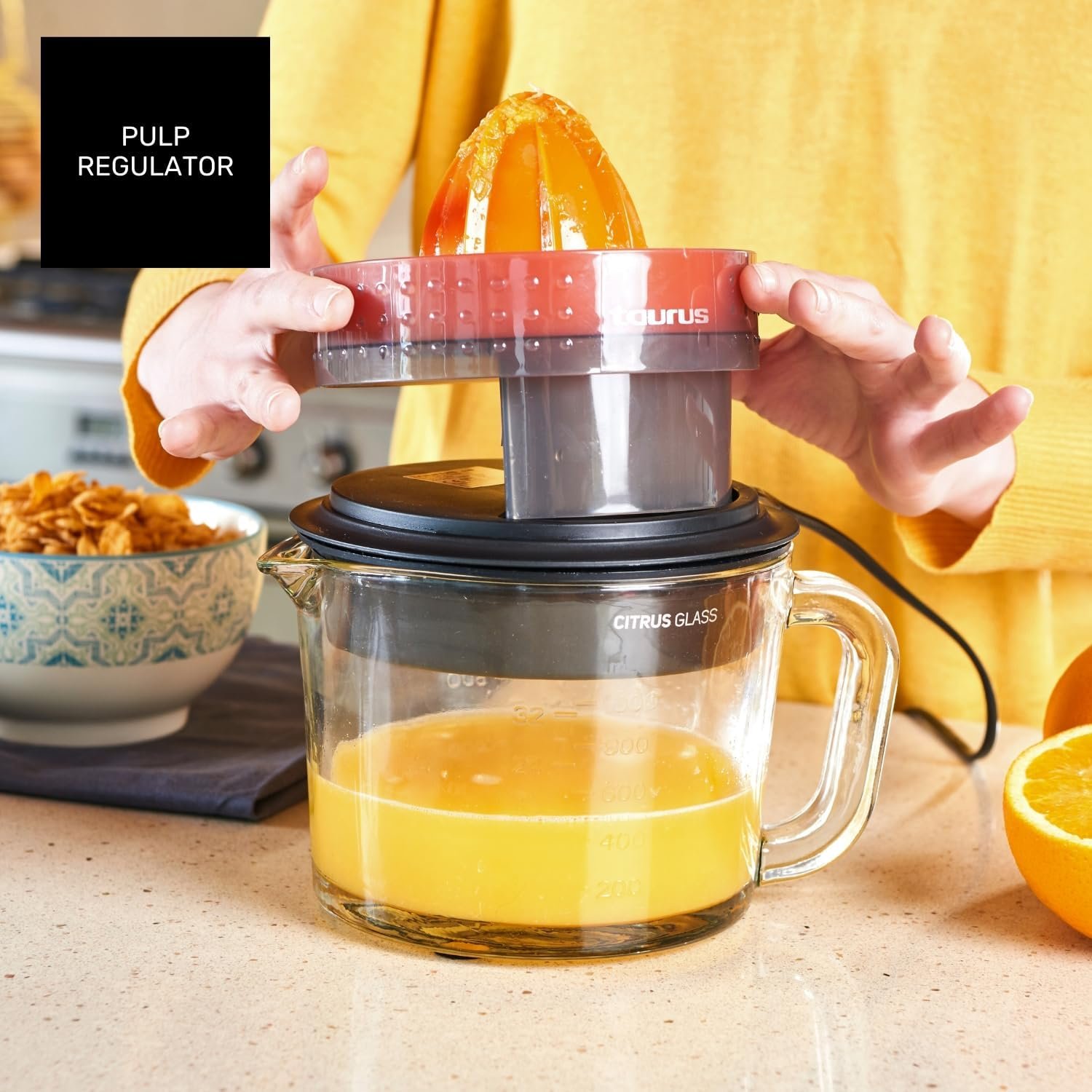 【PULP REGULATOR FILTER】 Adjust the amount of pulp in your juice thanks to the pulp regulator, to adapt it to your preference. In addition, it has 2 cones of different size suitable for all types of citrus, oranges, lemons, grapefruits..