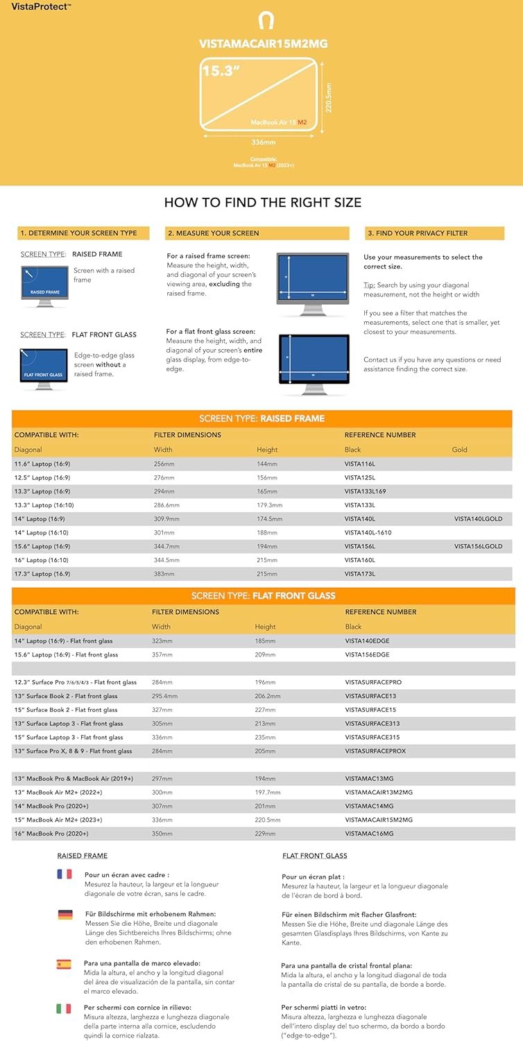 COMPATIBLE WITH APPLE MACBOOK AIR AND MACBOOK 15 M2/M3/M4 (2022+) – Diagonal: 15.3″ inches / Width: 336mm / Height: 220.5mm. Please contact us in case of doubt.