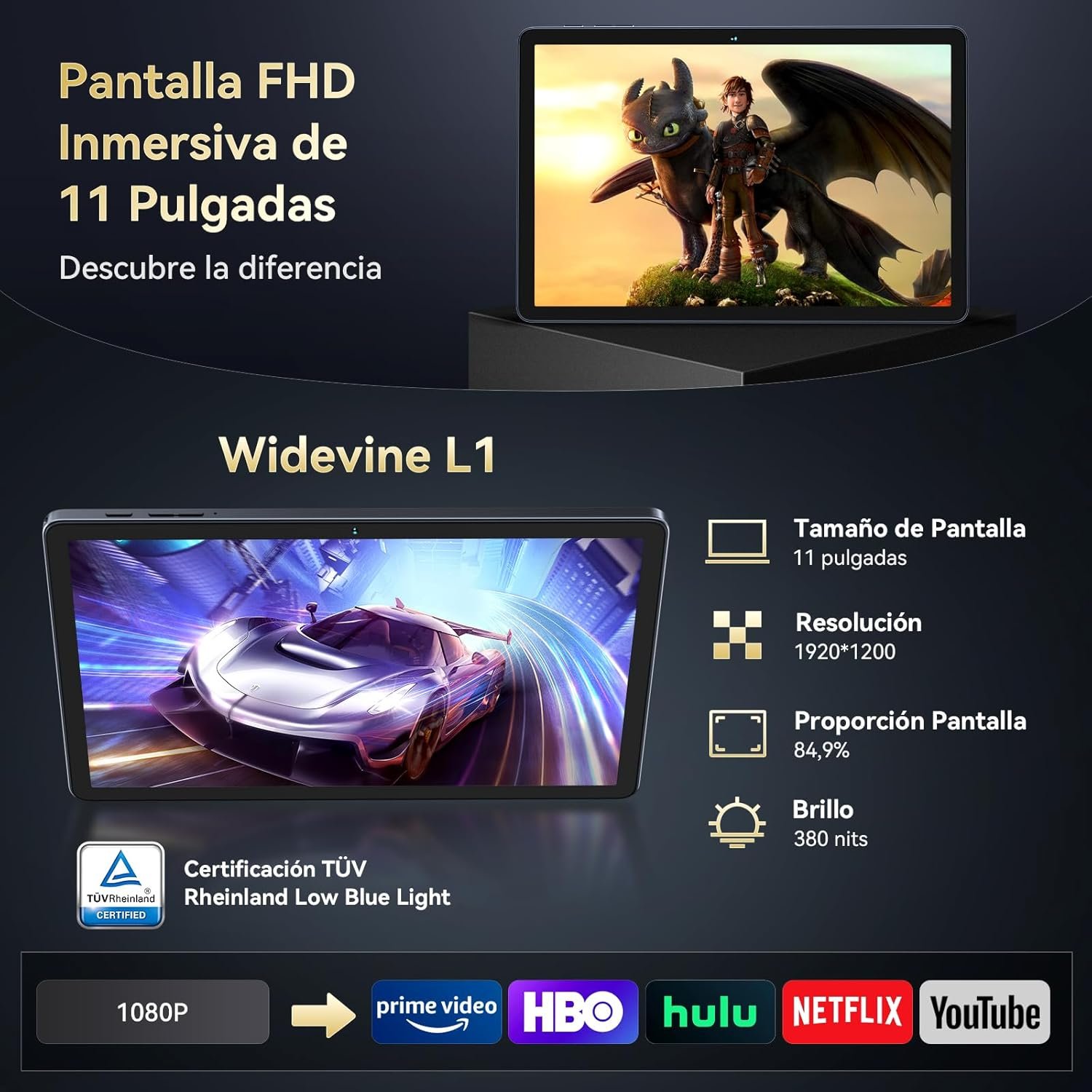 【11-inch FHD display + TÜV Eye Certified】Provides studio-level clarity on the 11-inch FHD IPS panel (1920×1200) with a maximum brightness of 380nit – readable in direct sunlight (tested to 50,000 lux). Widevine L1 certification delivers Netflix/Disney+/Prime video streaming in 1080P without degradation. Revolutionary TÜV certified blue light reduction (blocks 45% harmful wavelengths) and flicker-free DC dimming – lab tested to reduce eye strain by 52% during 3-hour movie marathons.