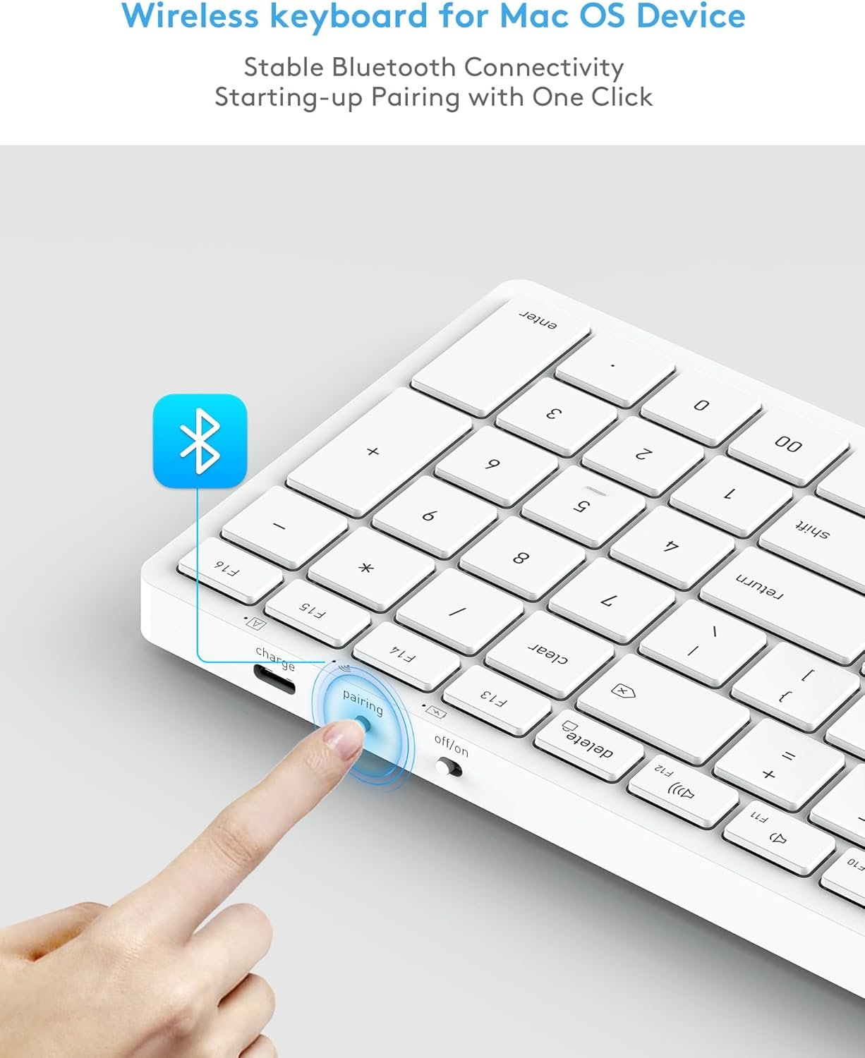 Teclado Bluetooth inalámbrico para Mac OS: Ultilizando la misma solución Bluetooth (tecnología Broadcom BT 3.0) que el teclado oficial de Apple/Mac, puedes obtener una experiencia de escritura estable, sin retrasos y precisa. Gasta menos dinero para obtener un excelente rendimiento del teclado para el dispositivo Apple Mac OS.