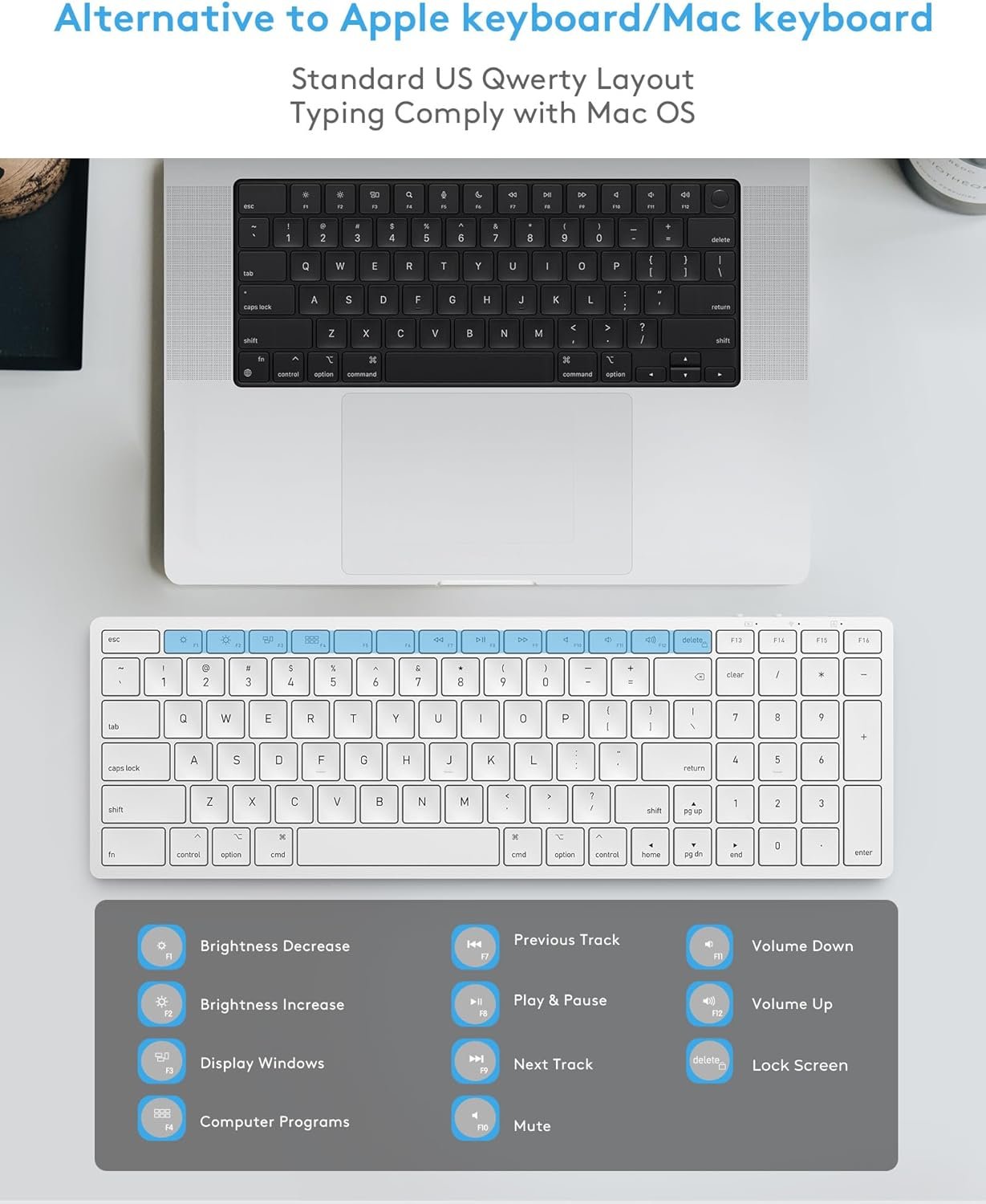 Instrucciones de las teclas de corte hortcut: 102 teclas (incluyendo 13 teclas de acceso rápido) están especialmente diseñadas para escribir en computadora Mac OS/portátil, es una alternativa perfecta para Apple Magic Keyboard, MacBook Keyboard o teclado iMac. También es compatible con el teclado de iPad como un teclado iPad.