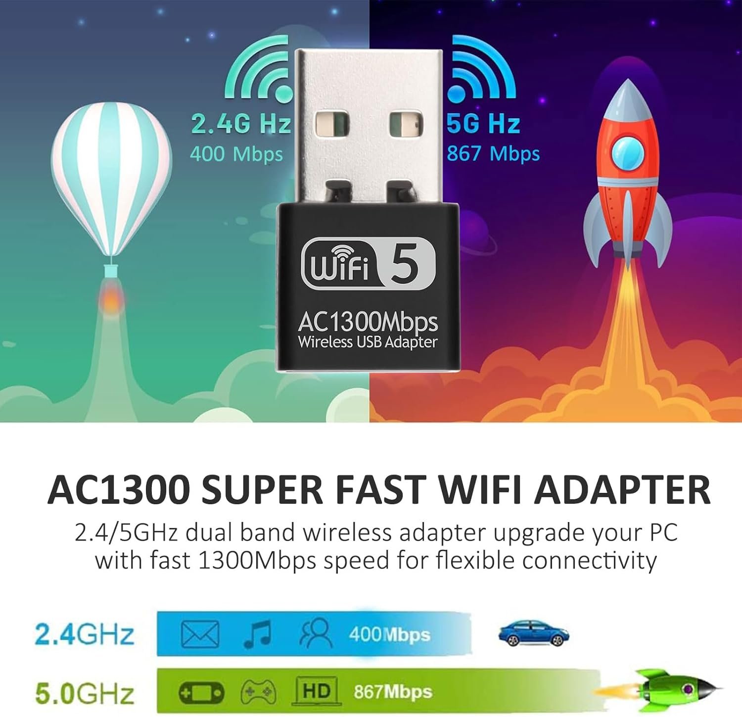 AC1300 Mini USB WiFi Antenna, Dual Band WiFi Receiver 5GHz/2.4GHz – USB Wi-Fi Adapter for PC Compatible with Windows 7/8/10/11/Vista/XP/Mac 10.9-10.15