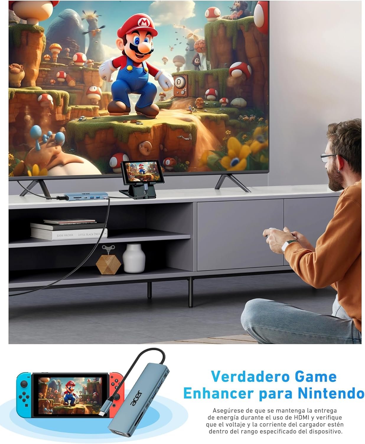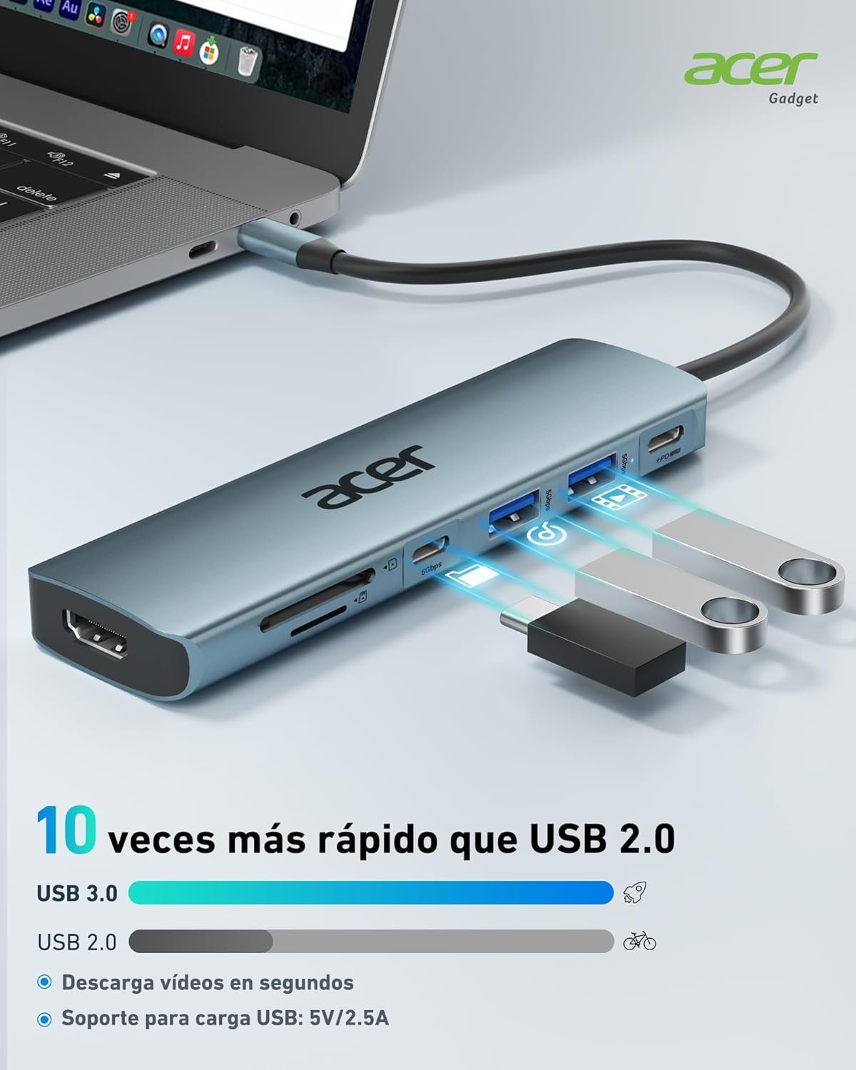【SD/TF Card Reader】acer USB C HDMI expansion hub with 2 SD card slots (SD/TF/Micro SD). It has a smart chip with a transfer speed of up to 5Gbps. In combination with a UHS-I card, a read speed of 104MB/s can be achieved.