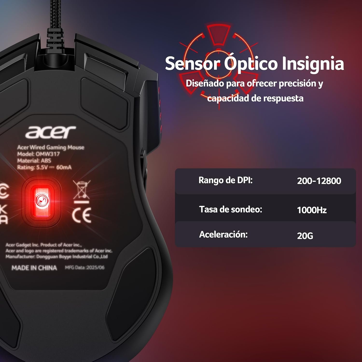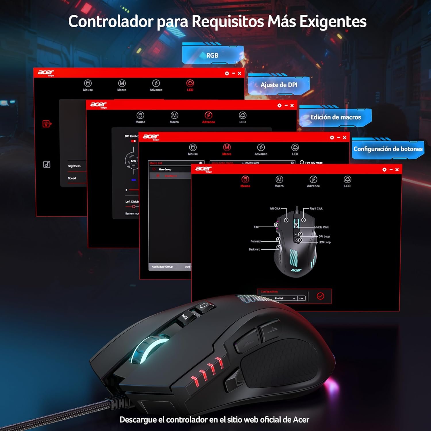 【Excellent Optical Sensor】The Acer gaming mouse is equipped with a high-precision sensor that glides smoothly over various surfaces, allowing you to move quickly and accurately. The maximum DPI resolution reaches 12800, with four adjustment levels: 1200/2400 (default)/3200/6400. It also features four polling rates (125/250/500/1000Hz) to reduce latency and ensure smooth movement. Custom adjustments can be made using the driver.