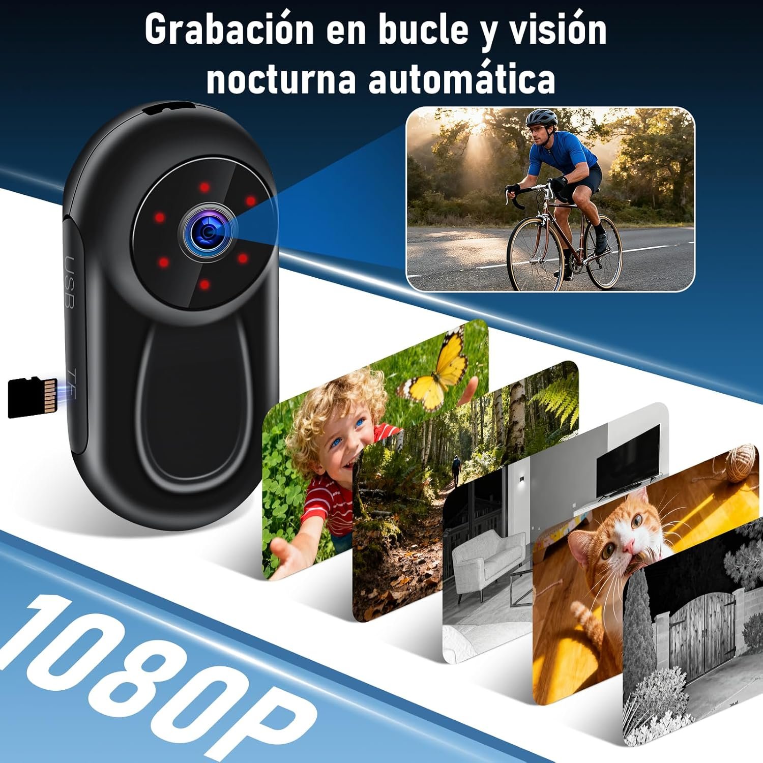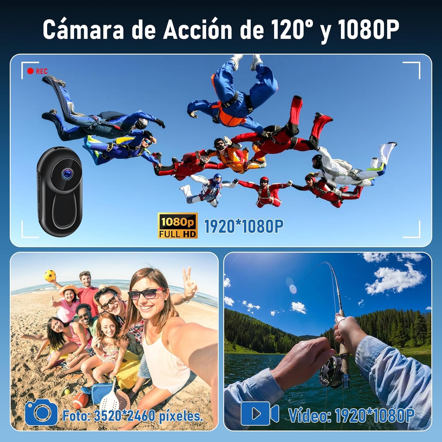 Cámara deportiva multifunción HD 1080p con soporte para tomar fotos y grabar vídeos con un ángulo de visión de 120°, grabación en bucle y visión nocturna automática.