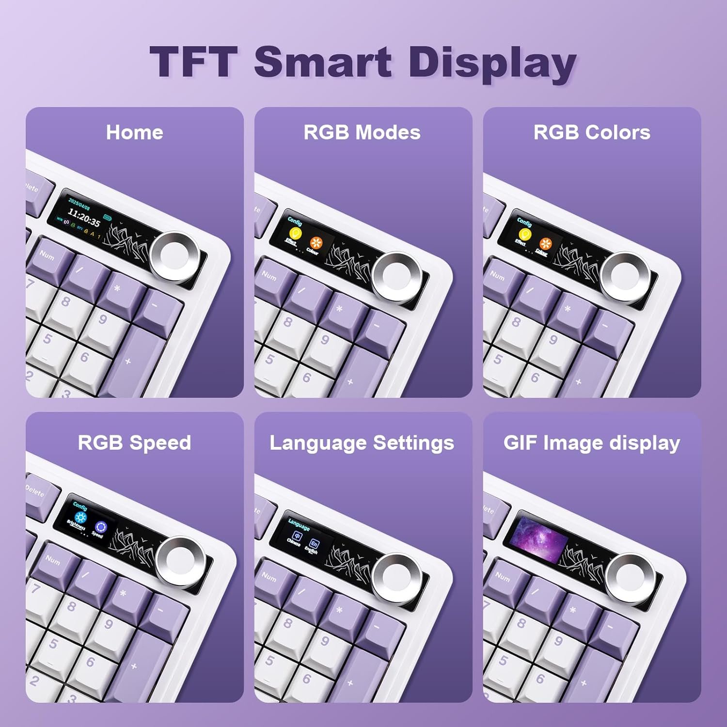 Smart TFT Display & Knob Design – The TFT display shows the date, time, battery level, custom GIF image, WIN/MAC design, connection mode, at a glance. Knob adjusts volume, light, no need for complex adjustments, fingertip movement, precise control, innovative design, empowerment for games and creative work, opening comfortable control