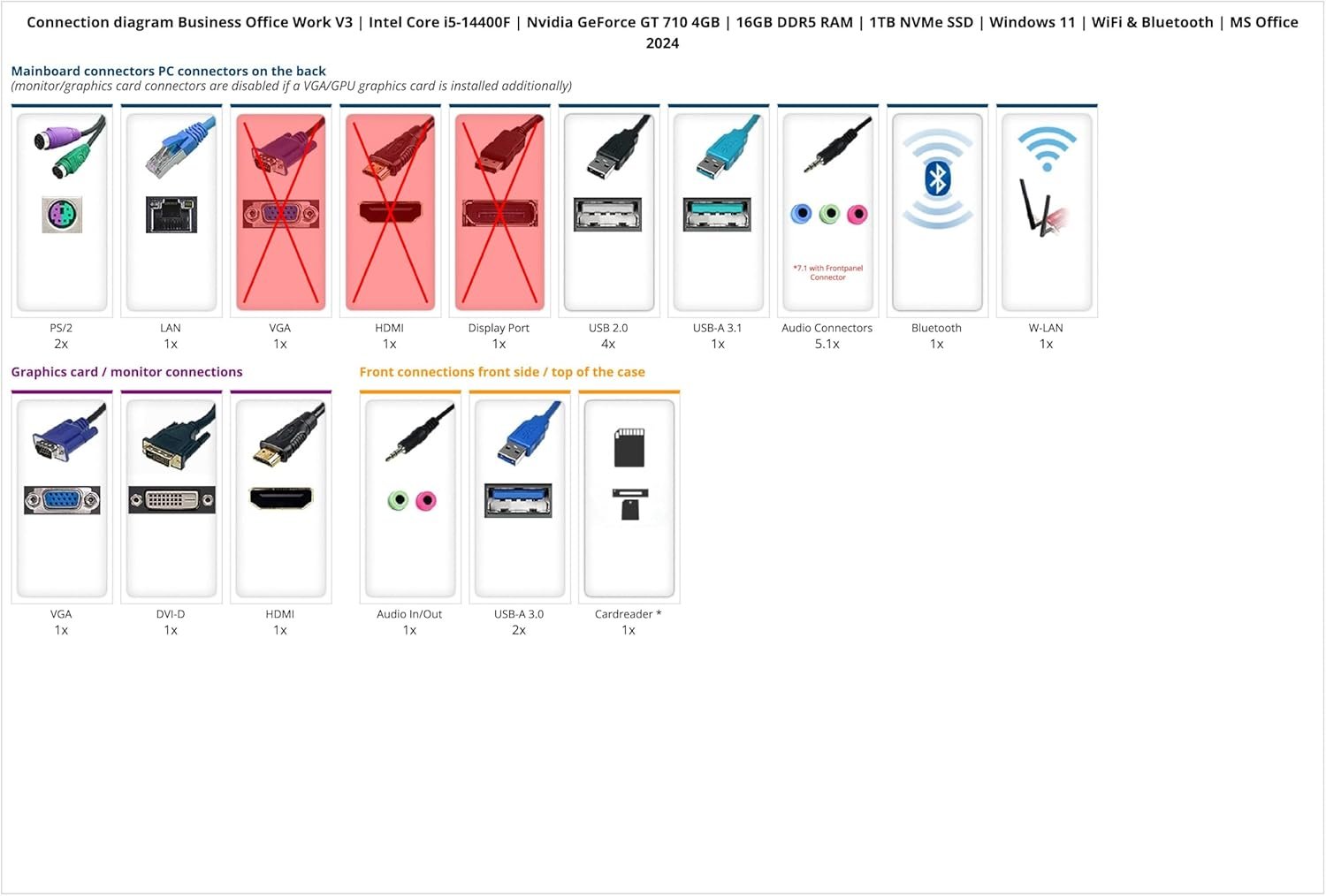 EAN: 4262530790257 – The Business Office Work V3 PC impresses with a modern Intel Core i5-14400F 10x 2.5 GHz – 4.7 GHz processor with 16GB DDR5 RAM on an ASUS PRIME H610M-A Mainboard. You get a modern i5 processor, an outstanding motherboard and fast RAM!