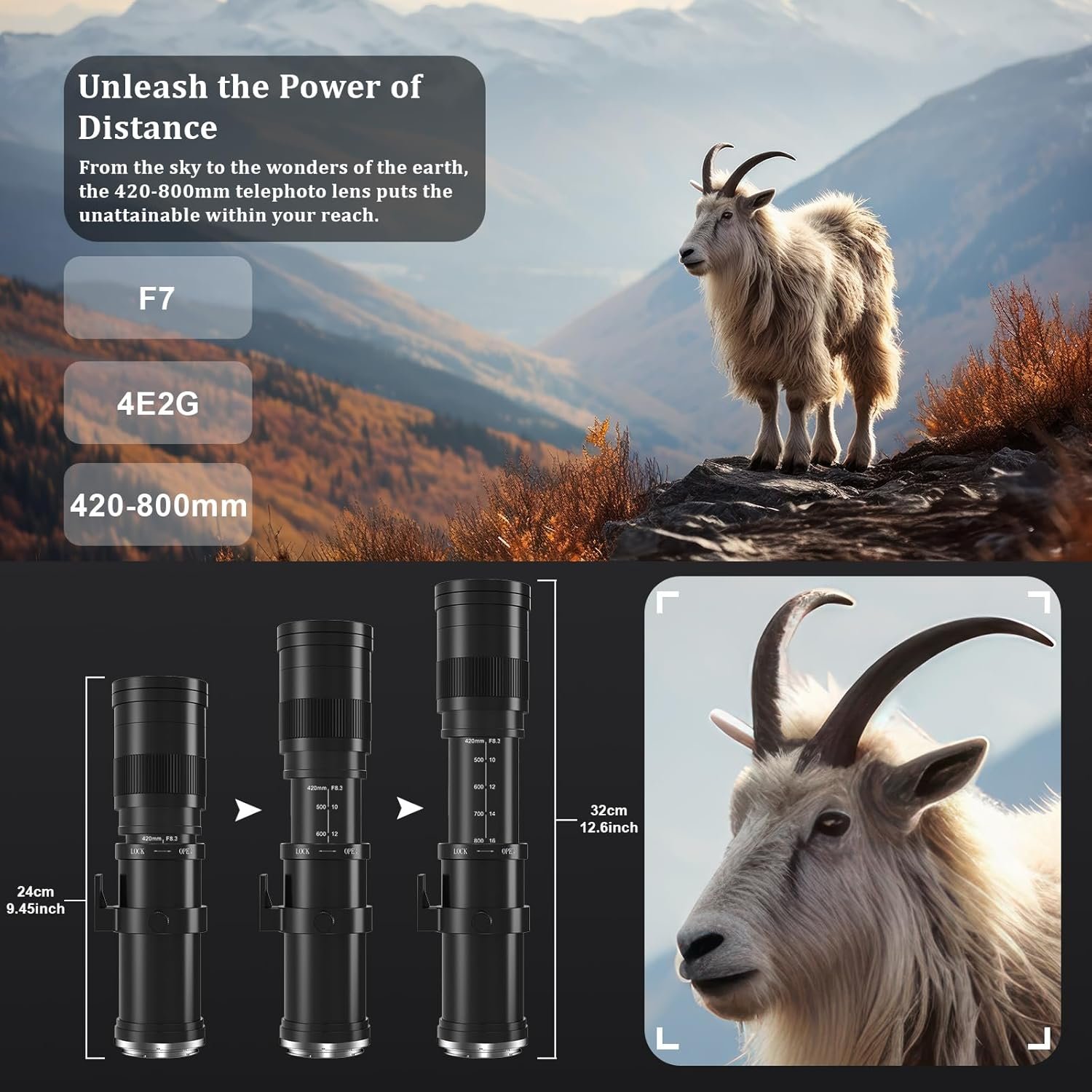 【Super Telephoto Lens】Manual focus telephoto lens, NOT original, a focal length of 420-800mm and an aperture of F/8.3-16 (aperture value not adjustable, f8.3 to 420mm and f16 to 800mm), filter size 62mm, full frame, mount. E, constructed with materials High quality and sturdy construction, making them durable and long lasting;