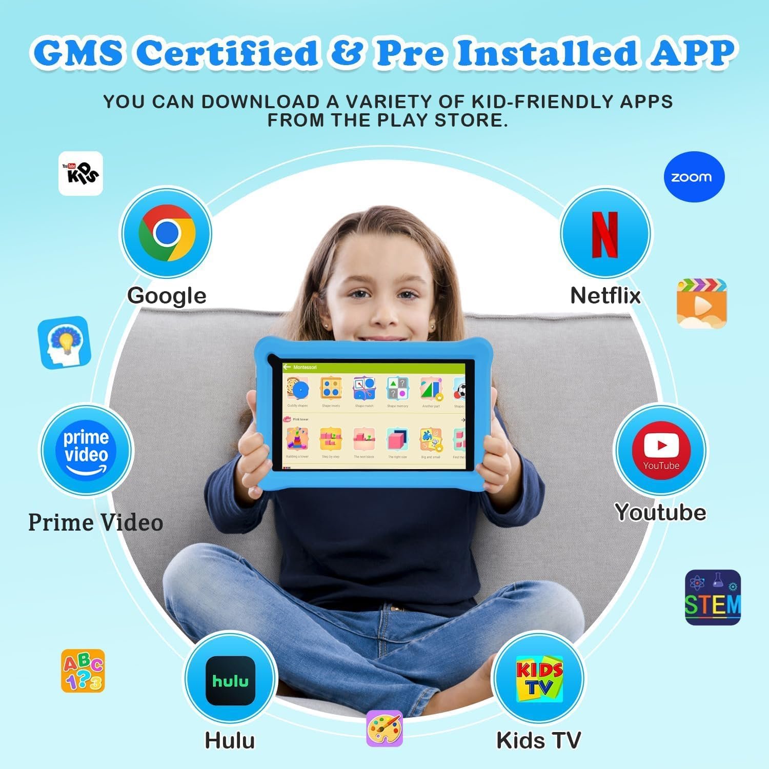 【Powerful Kids Tablet】This kids tablet is equipped with the latest Android 13 operating system, which improves the stability of the system operation and the security of the user’s private data. This children’s tablet has the Google GMS certification, which ensures maximum fluidity and secure access to millions of apps in the Play Store, including platforms such as Netflix, YouTube and ZOOM. Let your child always win on the starting line.
