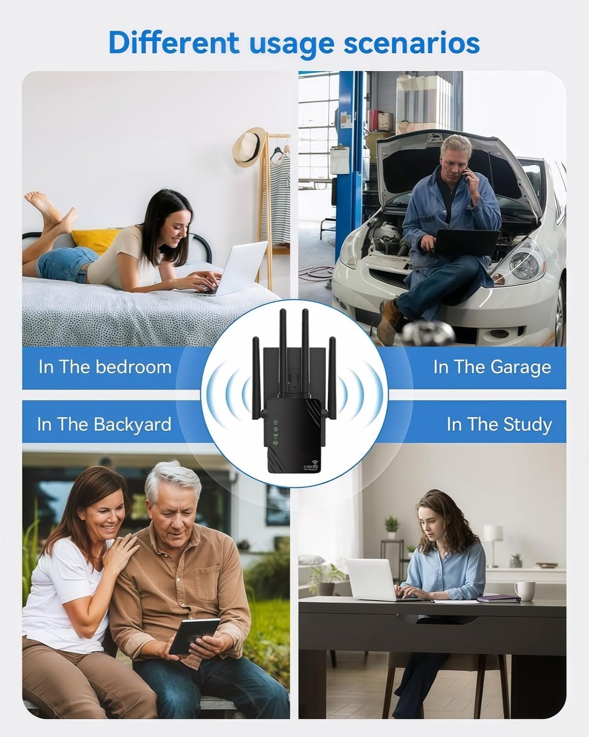 【12,880 Sq Ft Coverage】The WiFi range extender is equipped with 4 external antennas, with a coverage of 12,880 square feet, greater penetration and no signal loss through the wall. From bedrooms, bathrooms, garages, basements to gardens, you can enjoy the WiFi signal as you like. Farewell to the wifi dead corner