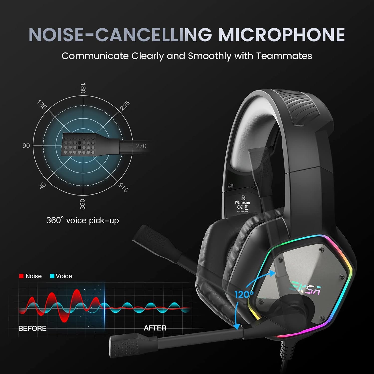 [Noise Cancelling Microphone] EKSA gaming headset for PS5 reduces background noise and ensures loud and clear communication with its 120° adjustable high sensitivity microphone. The omnidirectional noise reduction technology of the headset allows you to enjoy quality sound when gaming or chatting.