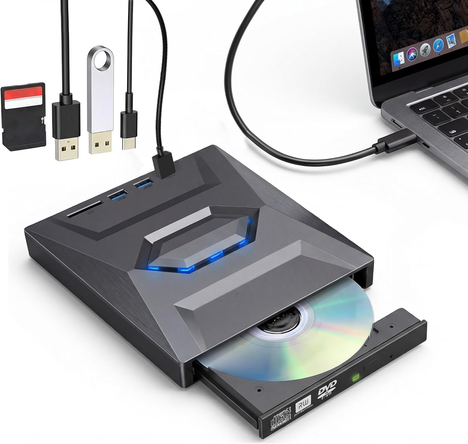 5 in 1 CD/DVD Drive:The external DVD drive can not only read CD/DVD, but also can be used as an external USB hub for laptop, which includes 1* USB 3.0 port, 1* USB 2.0 port, 1* USB Type-C port and 1 SD/TF card slot Compatible with USB hard drive, wired/wireless mouse and keyboard, computer refrigerator and other USB computer accessories. Support SD Card Reading: This is also an SD card reader.