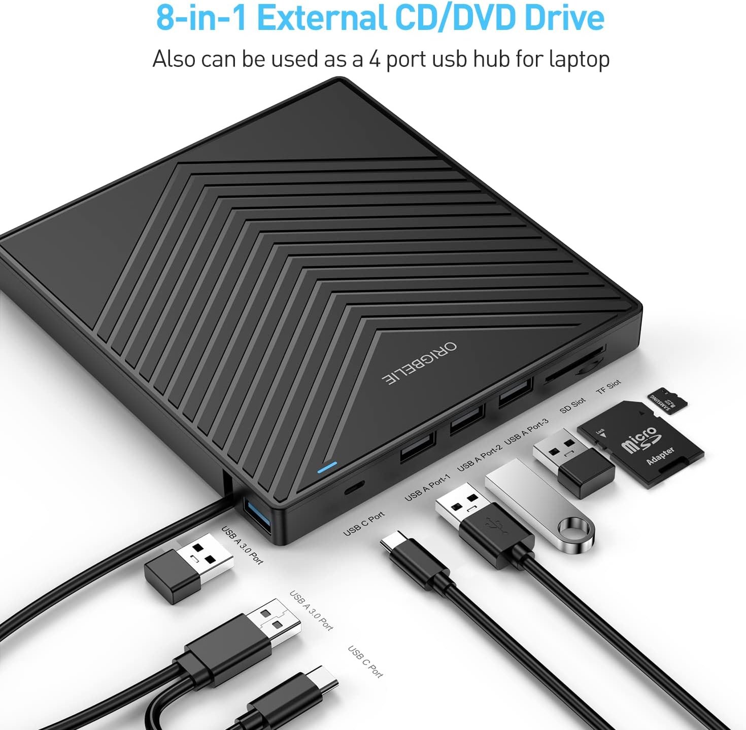 【8 IN 1 USB HUB】- External PC DVD reader can also be used as a USB hub, includes 1 USB 3.0 port, 3 USB 2.0 ports, 1 TF slot, 1 SD card slot and 1 USB C port. Note: SD port and TF port cannot be used at the same time.