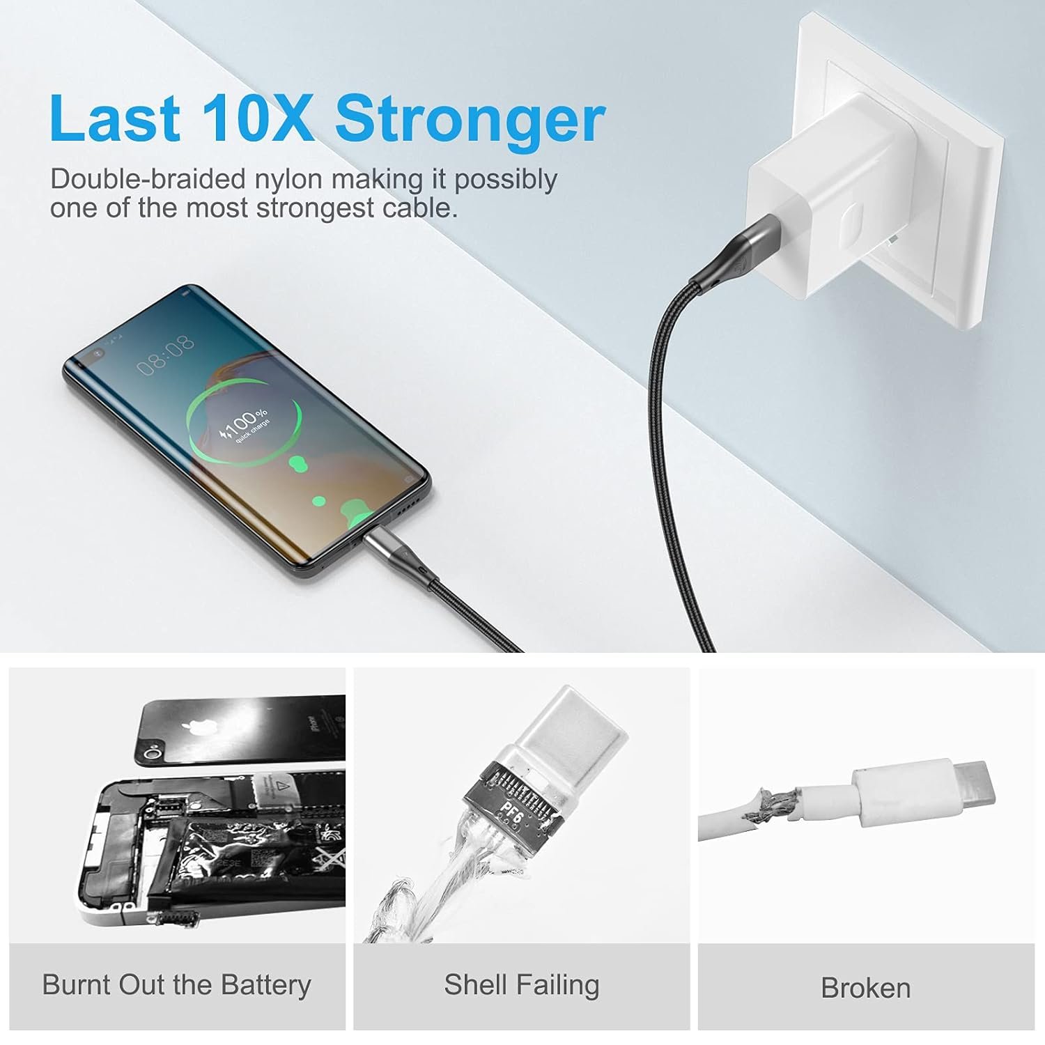 ULTRA DURABILITY – High quality braided nylon exterior with pure copper wires inside and laser-welded connectors for maximum reliability and durability. It has excellent anti-twisting and abrasion resistant property. Up to 10,000 bends and 6,000+ plugs and unplugs, even survived by pet chewing.
