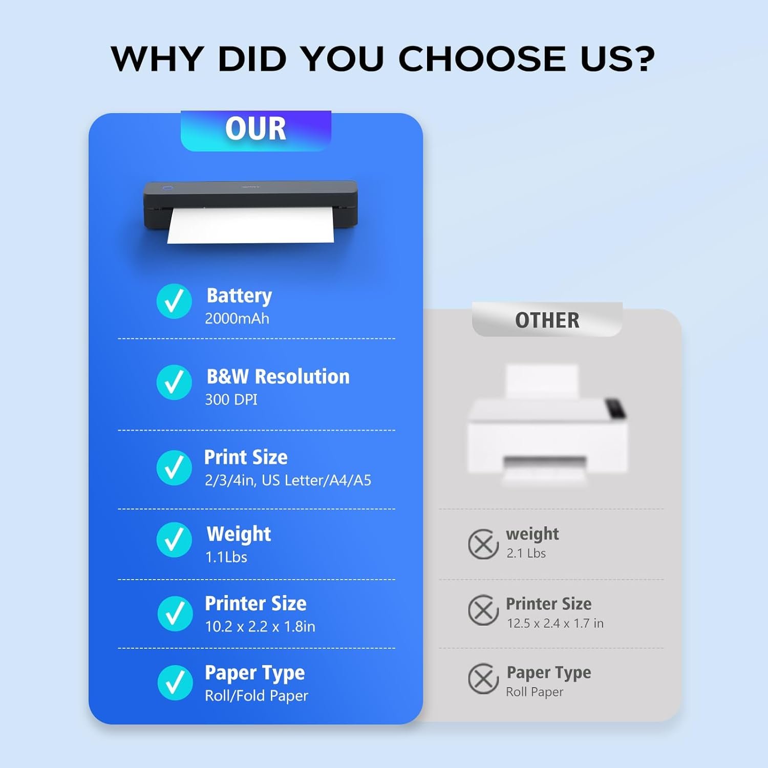 HIGH QUALITY PRINTING & DURABLE BATTERY – MT610pro 300 DPI travel portable printer is equipped with 2000mAh batteries and offers up to 4 hours of continuous printing and 360 sheets on a single charge. It can print contracts, receipts, photos, pictures, DIY projects, greeting cards, notes, to-do lists and more. (Note: Print on thermal paper only)