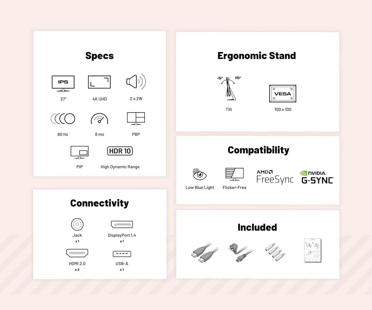 4K UHD 27» MONITOR: Enjoy an exceptional image clarity thanks to the 4K UHD IPS panel (3840×2160), ideal for creative professionals, advanced office work or entertainment. HDR technology enhances contrasts and colours for total immersion.