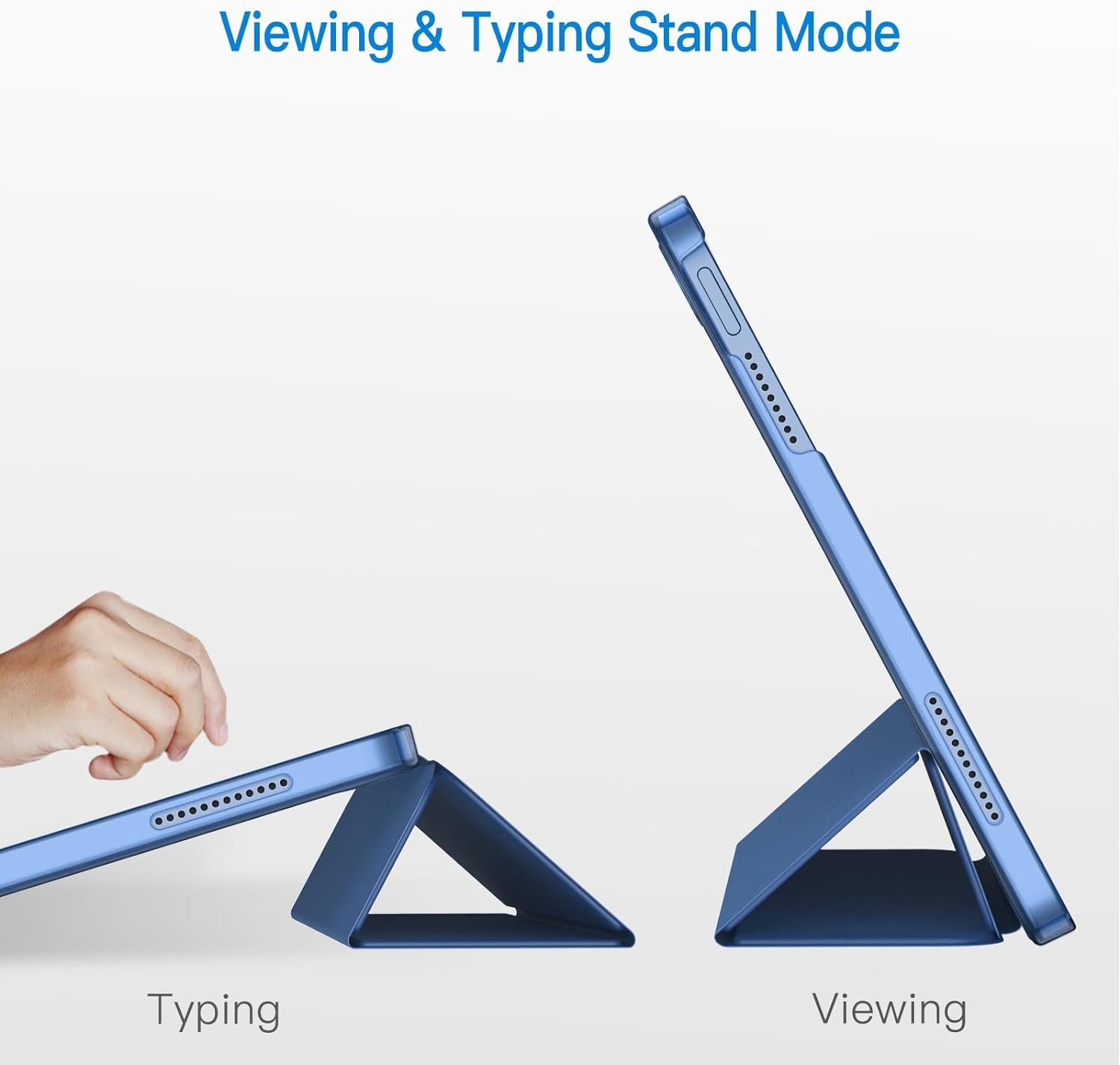 Magnetic smart cover supports automatic sleep/wake function. The tri-fold front cover can support iPad in two standing positions for viewing and typing