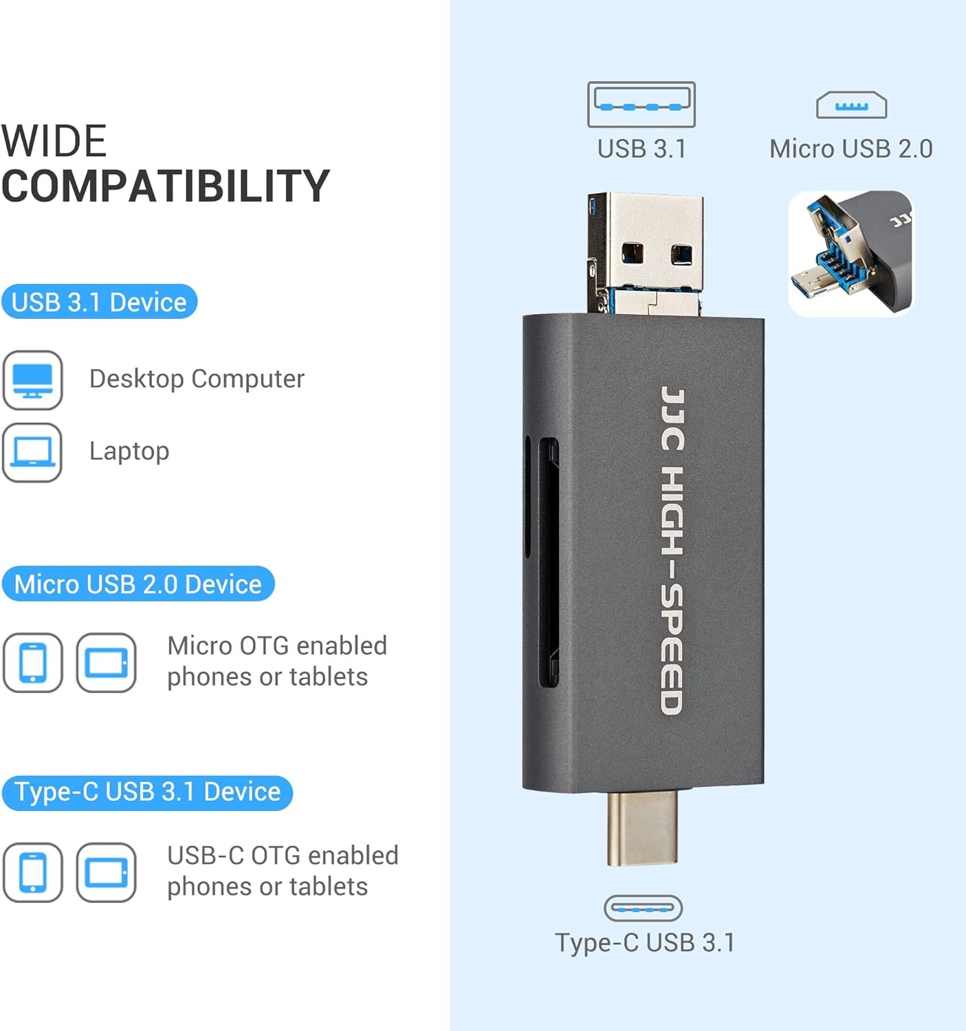 El lector de tarjetas JJC CR-UTC4AC USB 3.1 expande 2 ranuras para tarjetas (SD/TF) a tus computadoras, teléfonos o tabletas habilitados para Micro OTG/USB-C OTG.
