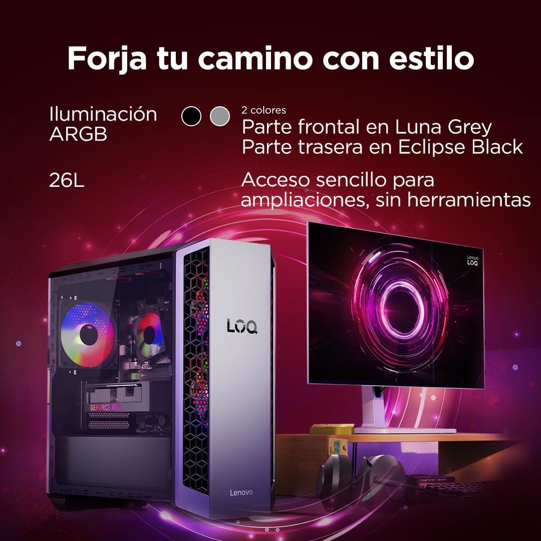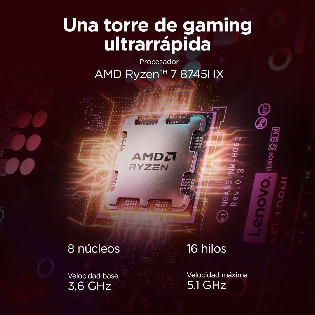 Procesador AMD Ryzen 7 8745HX Gráficos NVIDIA GeForce RTX 5060 8 GB GDDR7 Ventilador del sistema 2 ventiladores frontales de 120 mm con luz ARGB + ventiladores traseros de 120 mm con luz ARGB Factor de forma Torre (26L) Conectividad Wi-Fi 7 – Bluetooth 5.4 Ethernet Integrado 100/1000M Puertos principales 1x USB-C (USB 10 Gbps / USB 3.2 Gen 2), 2 puertos USB-A (USB 5 Gbps/USB 3.2 Gen 1), 1 conector combinado para auriculares y micrófono (3,5 mm) Puertos traseros 4x USB-A (USB de alta velocidad/USB 2.0), 1 HDMI 2.1 TMDS, 1x Ethernet (RJ-45), 1x auricular (3,5 mm), 1x conector de alimentación Chip de seguridad Firmware TPM 2.0 integrado en SoC Cumple con ErP Lot 3 – RoHS Sistema operativo Ninguno Software incluido Ninguno