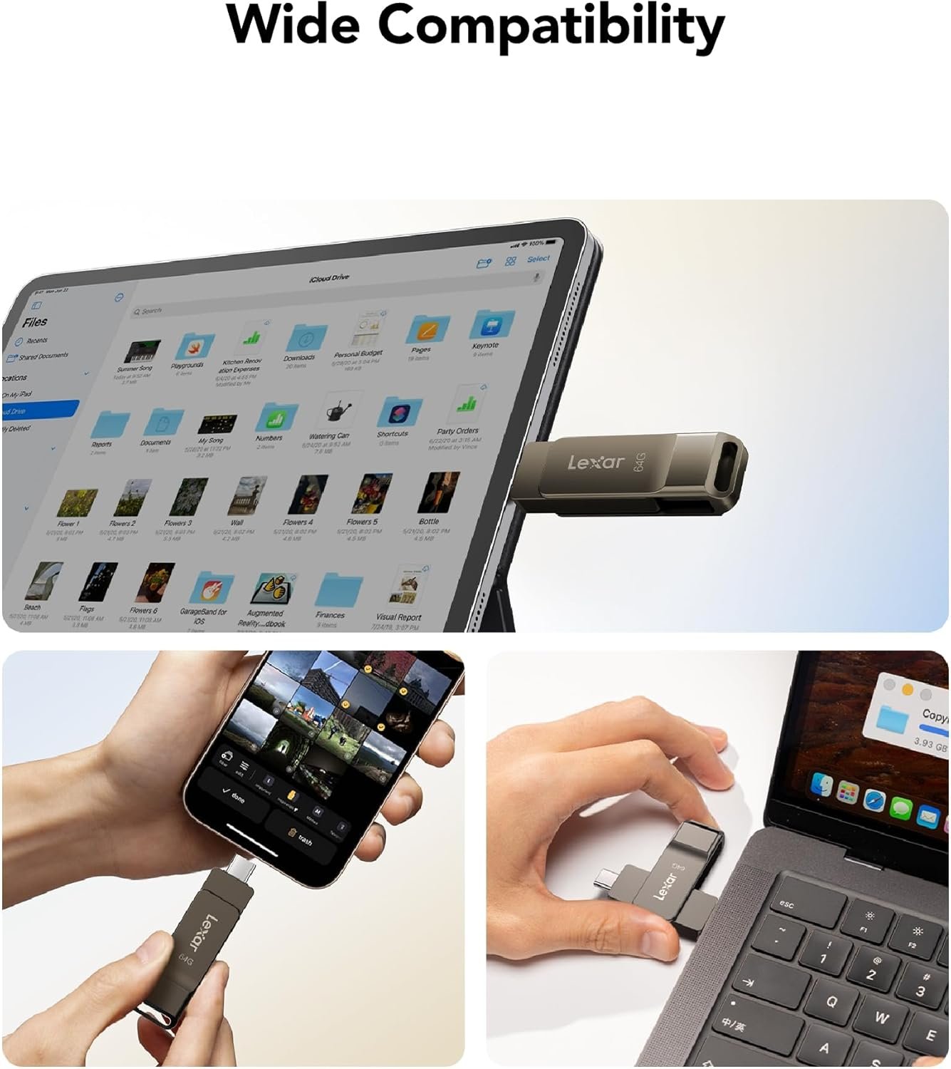 2-in-1 USB-C OTG Storage – The Lexar JumpDrive D40E dual drive features USB Type-A and Type-C connectors in a slim, portable form factor for easy device compatibility