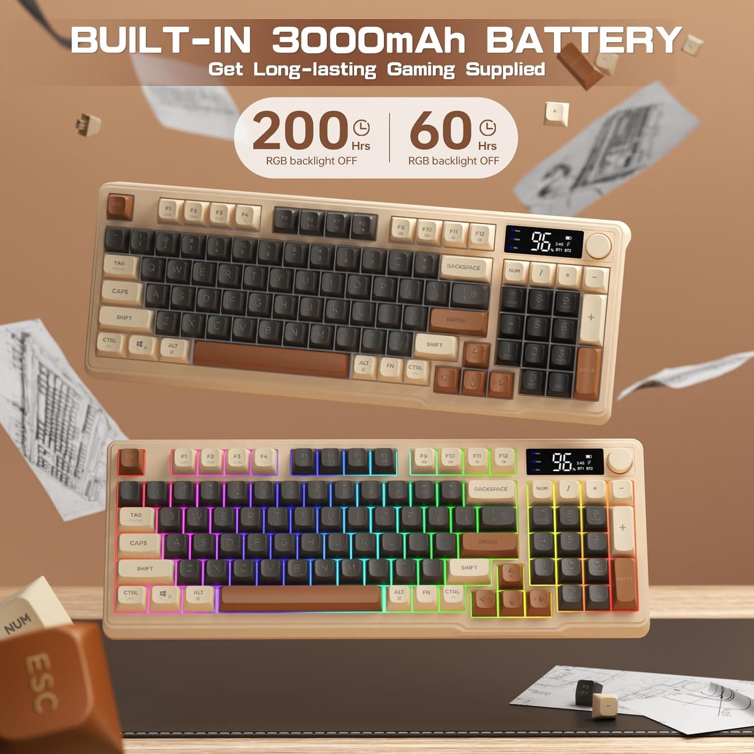 [2.4G/Bluetooth Connection] 2.4G and dual mode Bluetooth wireless connection make this keyboard extremely stable and durable, with stable operation and not easy to disconnect. This keyboard comes with an LED electronic display, built-in 2000Ah battery, ultra-long battery life, real-time display of battery level and connection status, making it easy to master the operation.