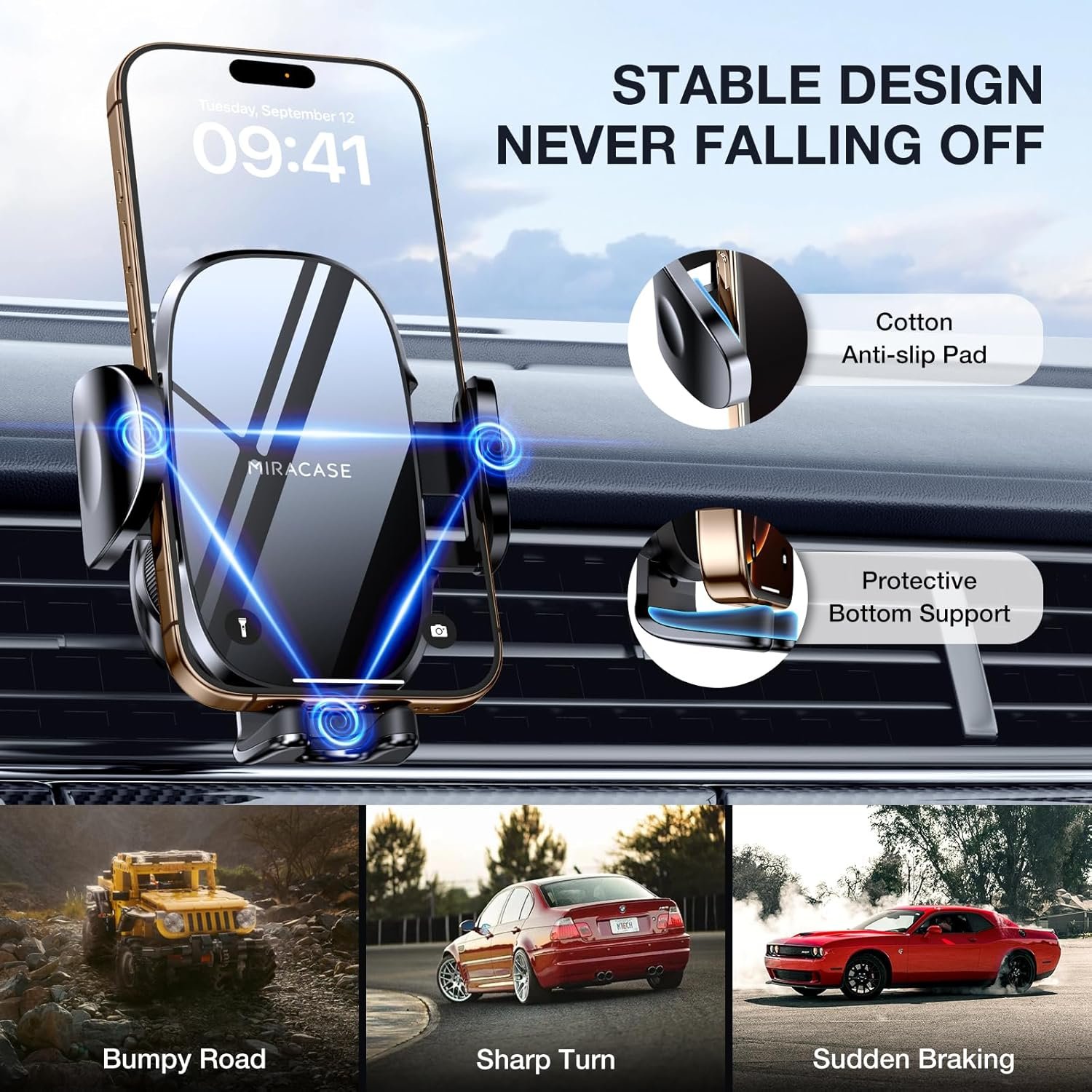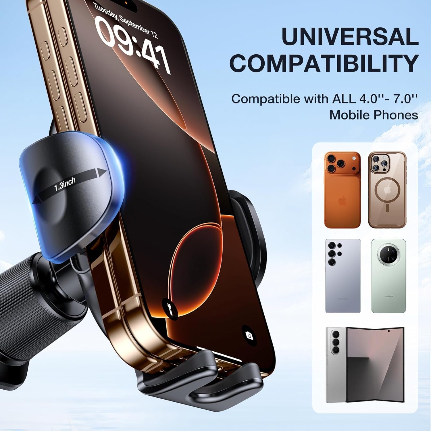 DOUBLE PROTECTION FOR COMPLETE PEACE OF MIND – The clamping arms and base bracket are equipped with thick and soft silicone pads that provide full protection from scratches. Combined with the upgraded non-slip and shock-absorbing design, a key feature of this iPhone holder for car, your phone stays firmly in place even on rough roads, giving you complete confidence when driving