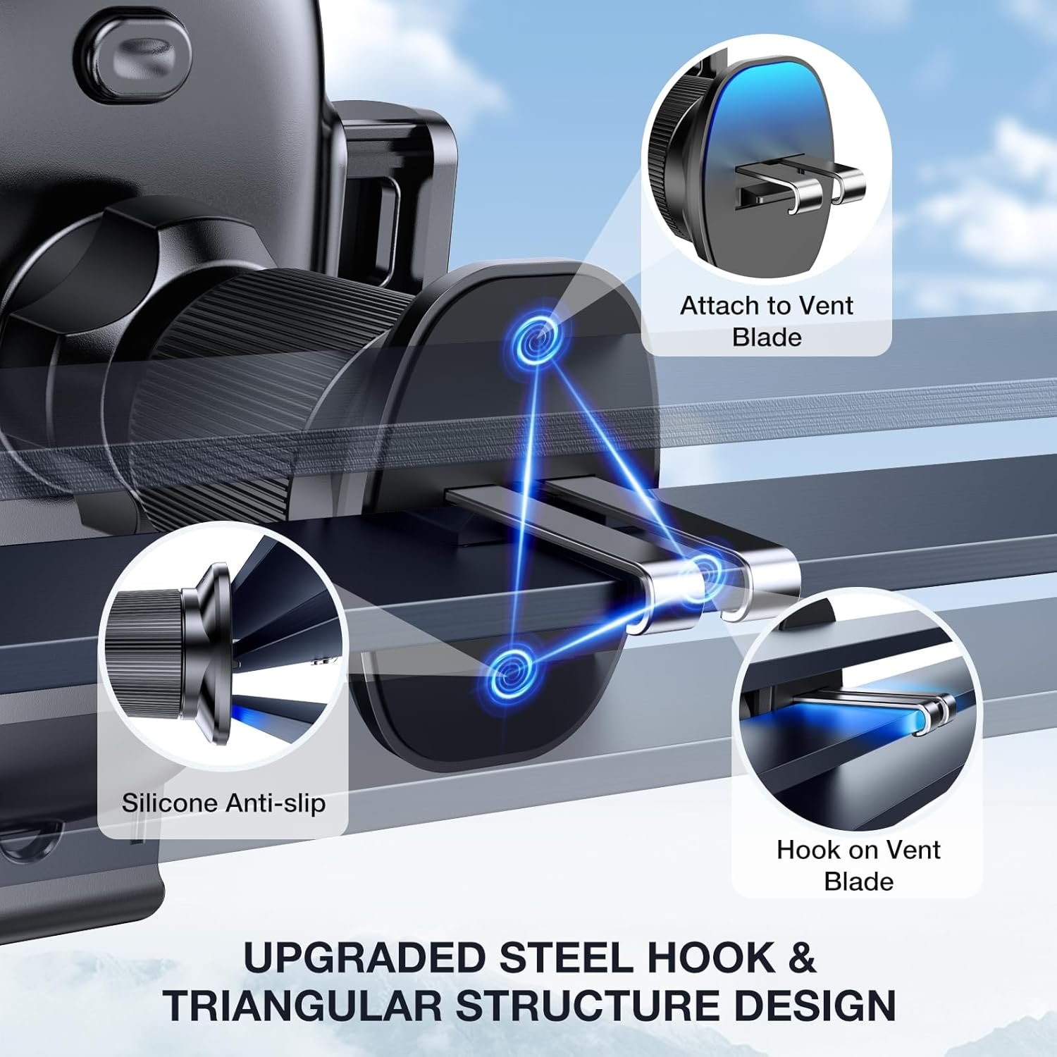 Upgraded Alloy Hook, Solid Stability – With a high-strength alloy hook and precision knob mechanism, this mobile phone holder for car locks securely into your car air vent for a firm and reliable installation. Stays stable even on bumpy roads, during sharp turns or under sudden braking, ensuring never loosen or fall off