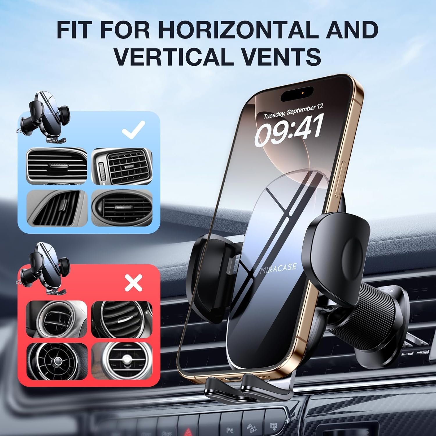 WIDE COMPATIBILITY, ONE HOLDER FOR EVERYONE – With its fully adjustable clamping arms, this car phone holder easily fits phones ranging from four to seven inches, covering the vast majority of models on the market. It is specially designed to be used with most phone cases. The multi-directional ball head also ensures a secure fit on both horizontal and vertical car vents