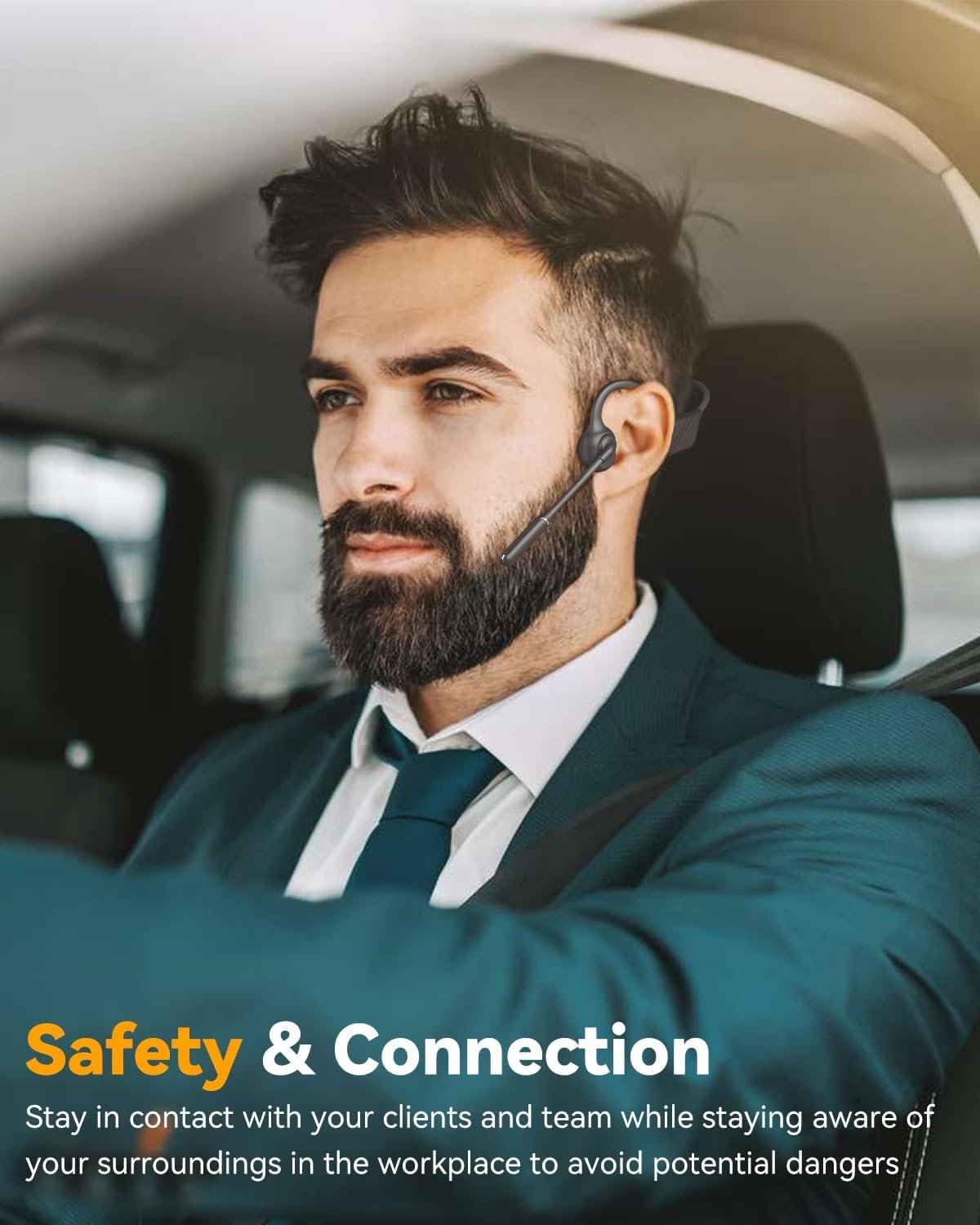 COMFORT AND DURABILITY – This bluetooth headset with microphone weighs only 33g. The soft silicone pads soft to the skin and ergonomic design make you barely feel it on your head. The aluminum alloy back of bone earphones is strong and durable, tight close to the back of the ear which is stable without moving or falling off, give your ears a comfortable wearing experience.