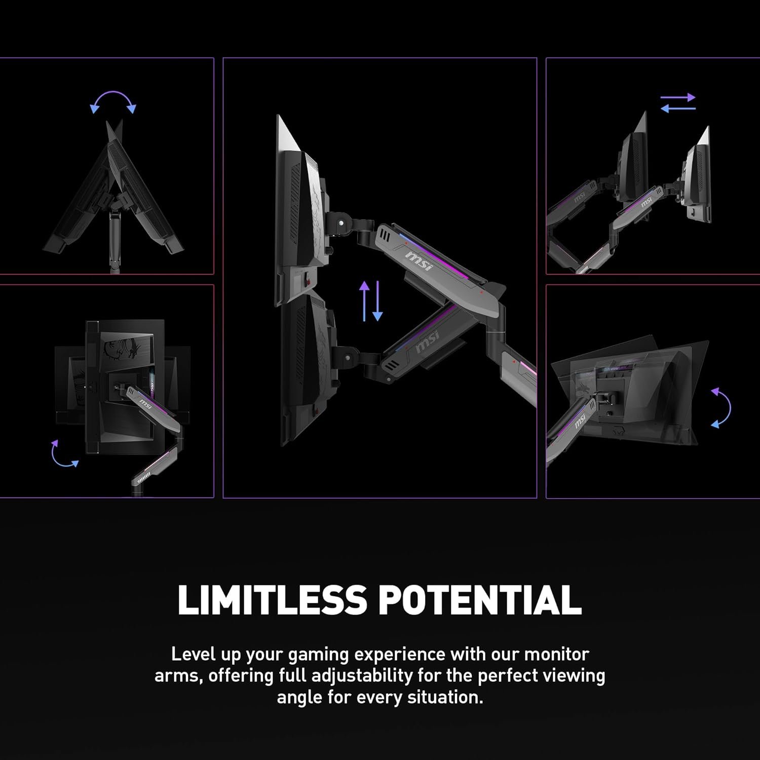 Elevate your workspace with the high-quality MSI MPG MT201R RGB Support Arm. Experience the ultimate in ergonomic comfort and productivity with our fully adjustable gas spring mount. Perfect for 17″ to 49″ monitors, the arm features a 44-pound capacity per screen, ensuring stability and versatility. Compatible with VESA mounting standards (100×100 and 75×75), installation is a breeze with the quick release plate. Upgrade your setup with a sleek grey aesthetic. Plus, enjoy peace of mind with our 3-year coverage.