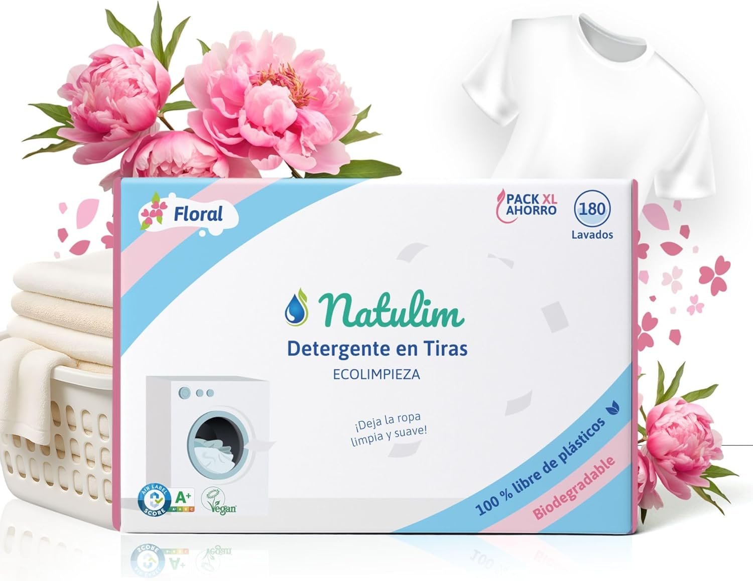 Natulim Washing Machine Detergent Strips (180 Washes) – Includes Softening Effect, Eco-Friendly, Hypoallergenic, Zero Waste, Made in Spain – Clean and Soft Clothes Without Mousing the Planet (Floral)