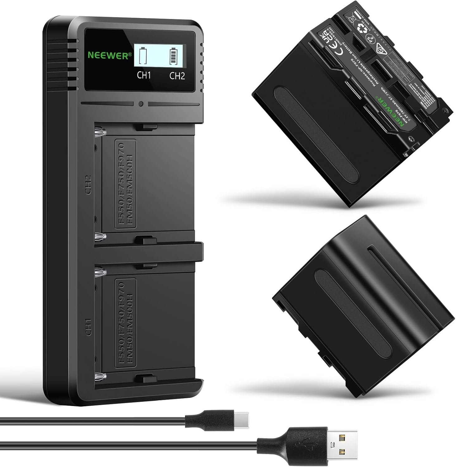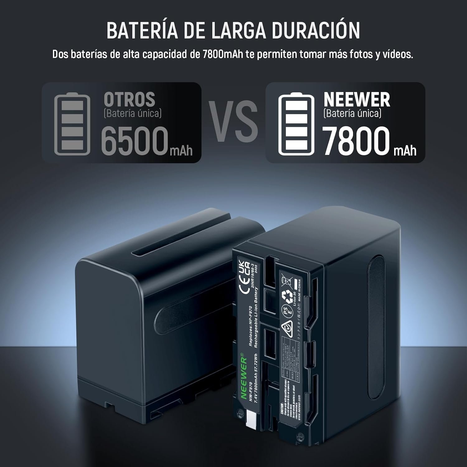 【2 Upgraded 7800mAh Replacement Batteries】 NEEWER NP-F970 rechargeable lithium battery features a high capacity (7.4V, 7800mAh, 57.72Wh) and offers longer battery life than common NP-F batteries. Made with premium cells, it can give you abundant and steady battery power to capture every wonderful moment in life.