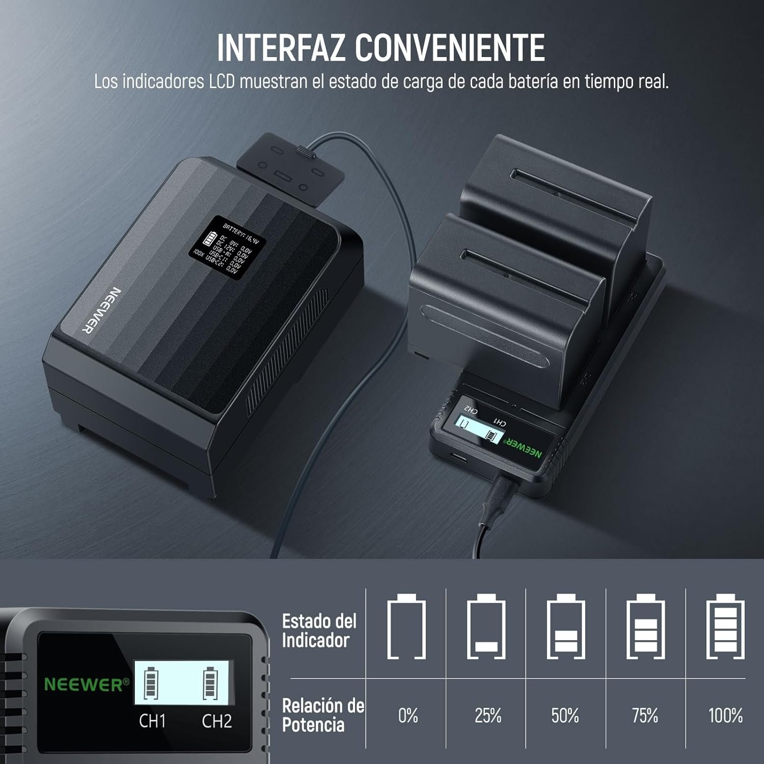 DUAL BATTERY CHARGING You can charge two compatible NP-F batteries simultaneously by placing them in the charger properly. NPF battery fast charger has an LCD display that lets you know the charging status in real time