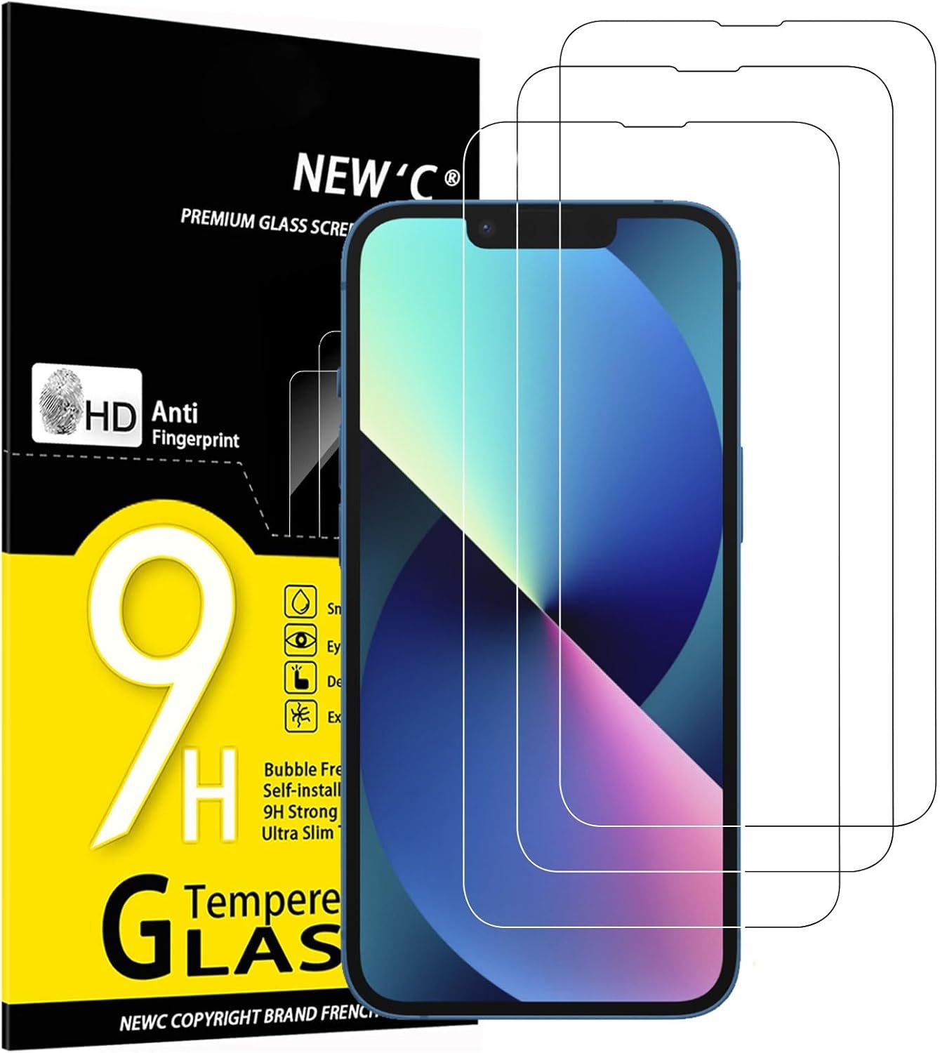 NEW’C 3 Pieces, Screen Protector for iPhone 14, iPhone 13, iPhone 13 Pro (6.1 Inches), Tempered Glass, Anti-Scratch, Anti-Fingerprint, 9H Hardness, 0.33 mm Ultra Transparent, Ultra Resistant