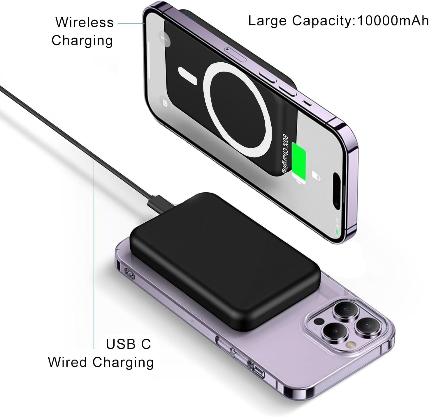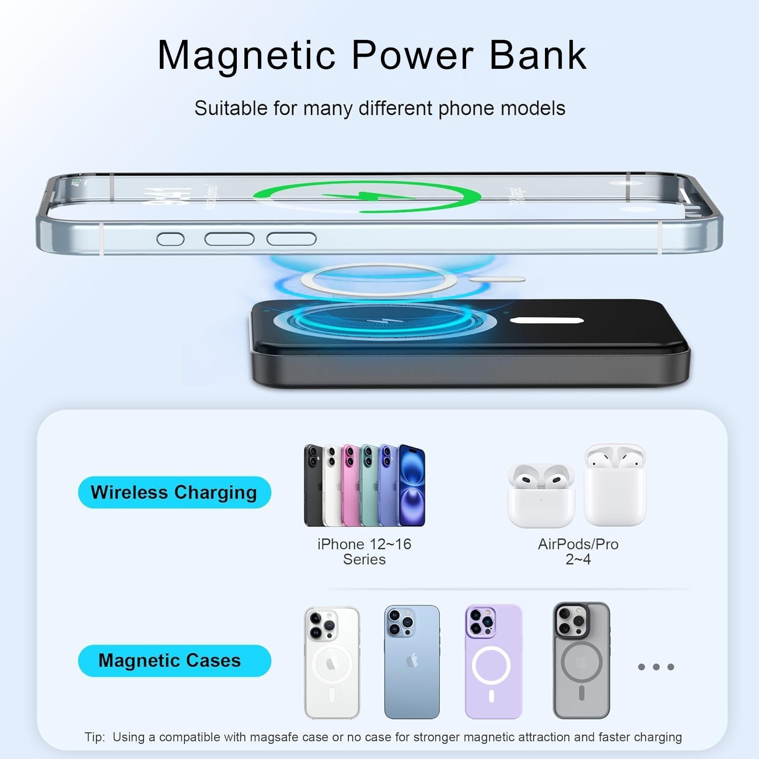 【Magnetic Power Bank】This magnetic power bank adopts the latest magnetic technology (magnetic adsorption and stronger nano), connects directly to the back of your iPhone, ensures perfect alignment and efficient charging. It is designed for iPhone 16/15/14/13/12 Series.