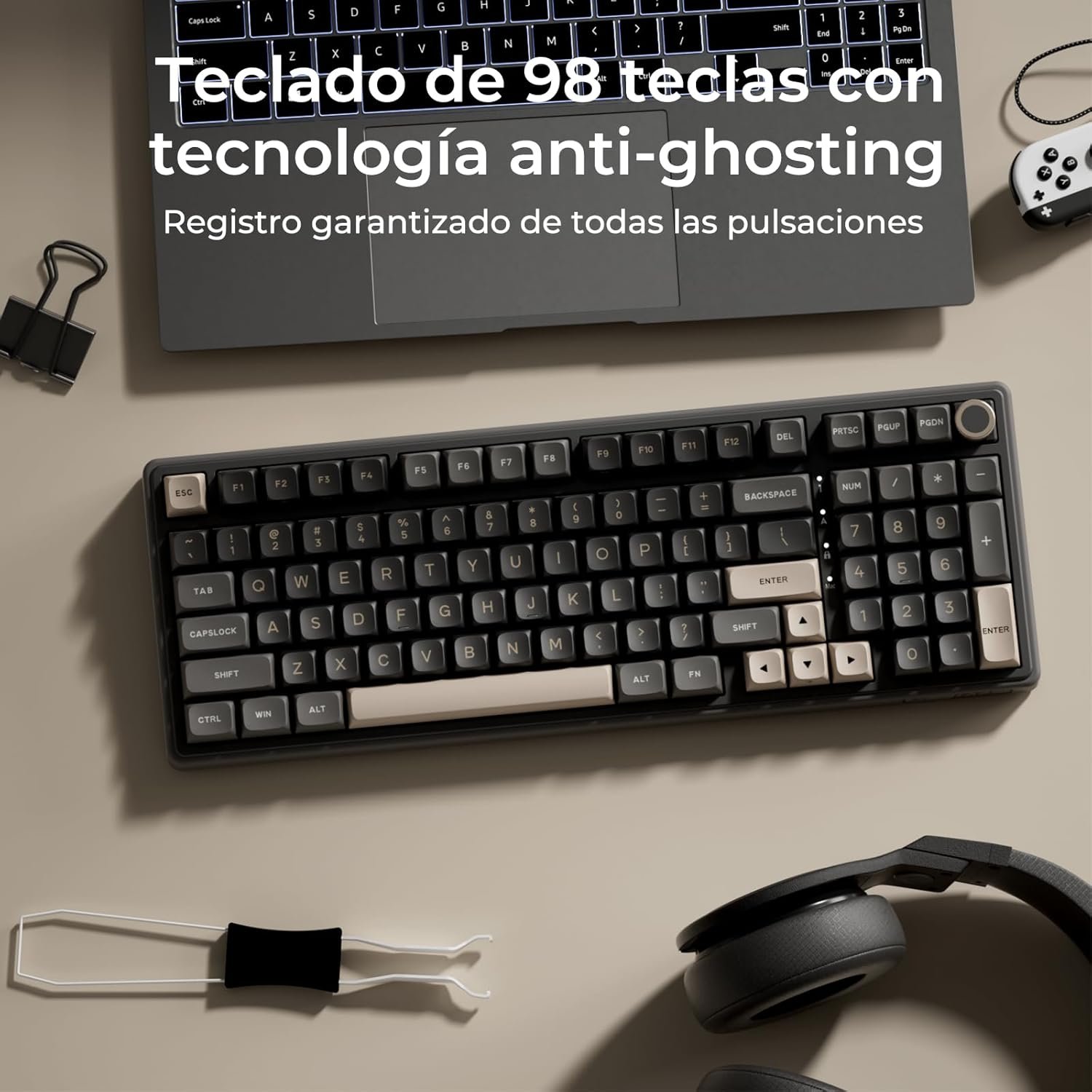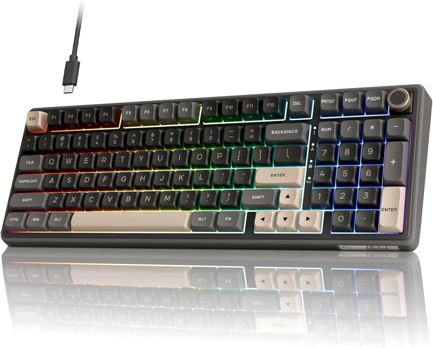 【Detachable Volume Knob and Indicators】RK ROYAL KLUDGE R98 Pro gaming keyboard includes a detachable aluminum CNC metal knob to adjust the volume quickly. Four indicators show Num Lock, Caps Lock, Win Lock and Mac Mode, allowing you to see keyboard status at a glance