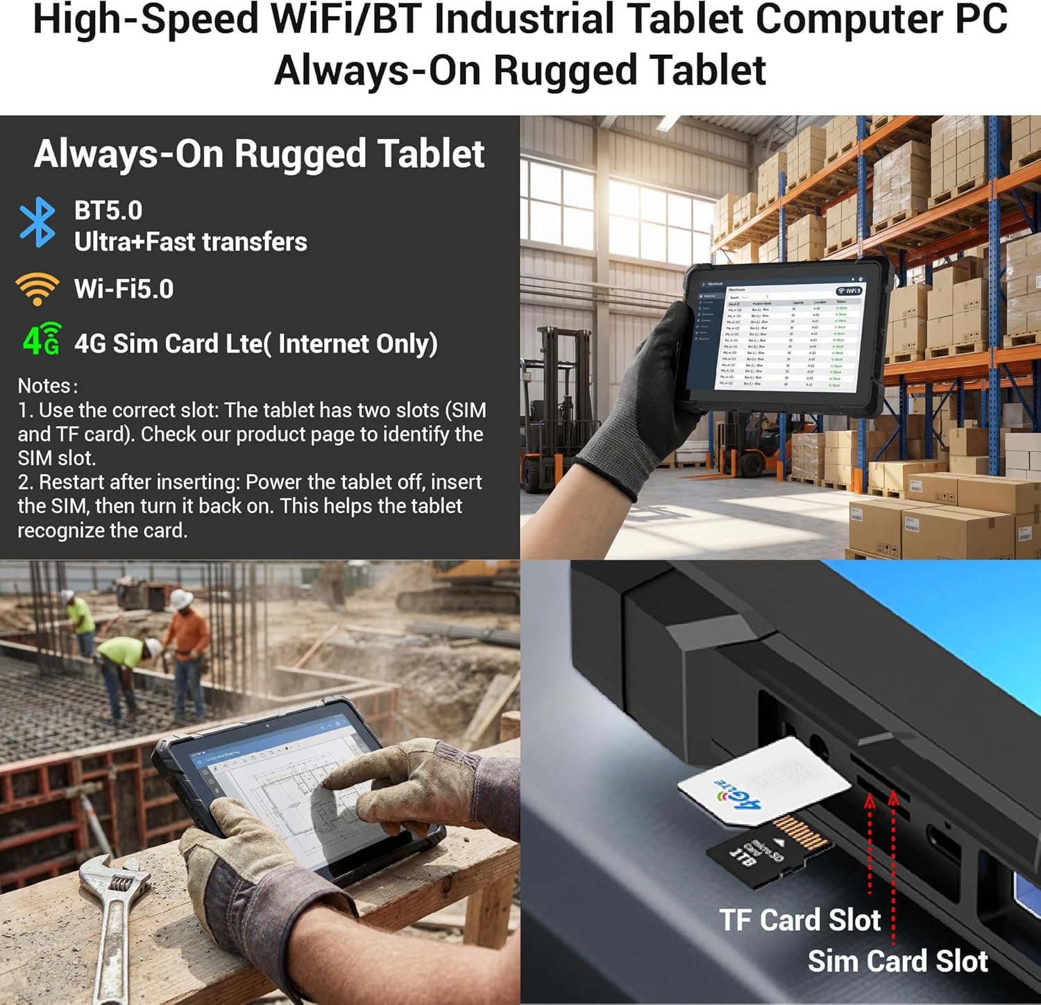 Rugged Tablet with Win 11, 4G LTE, WiFi and Bluetooth – This water-resistant Windows tablet includes SIM card slot with 4G LTE access. The 10.1 inch screen supports network calls/Internet. Equipped with high-speed WiFi (2.4GHz + 5GHz), ensure stable connection. In addition, thanks to its Bluetooth 5.0 technology, the device can transfer data without the need for an internet connection.