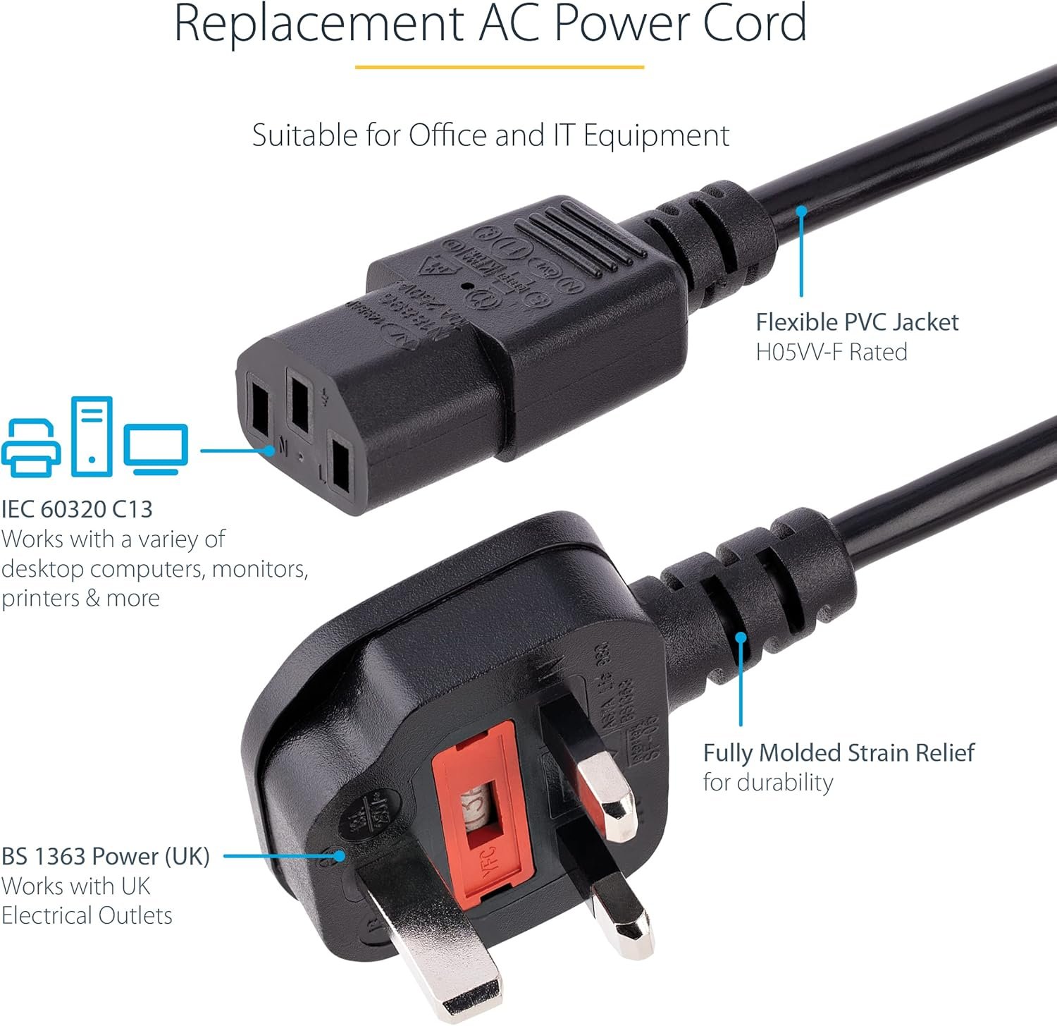 COMPATIBILITY: BS 1363 works with UK outlets | IEC C13 connector works with most desktops, and other computers | Replacement cable, Kettle Lead