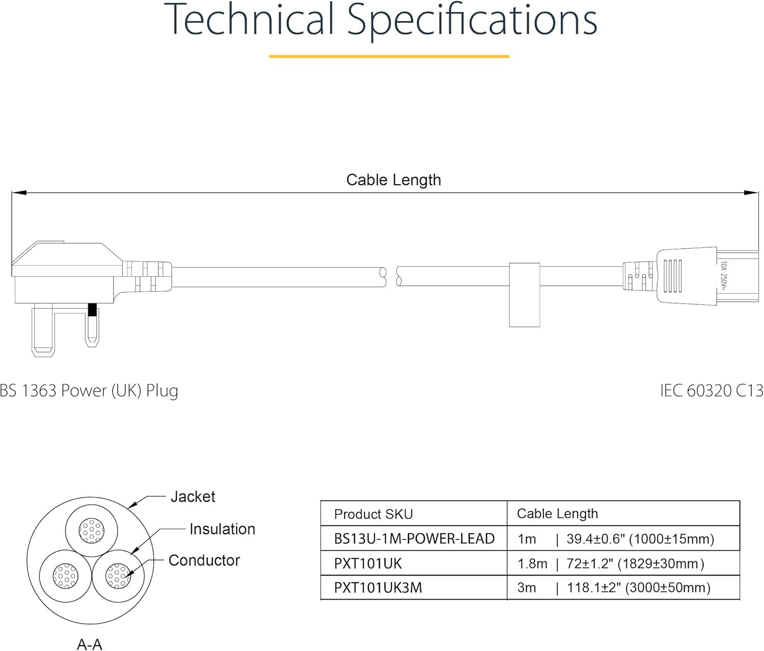 SPECIFICATIONS: 1.8m Cable | BS 1363 to IEC 60320 C13 | 18AWG (0.75mm2) | 250V 10A (Max) | Classification/Cover Material: H05VV-F/PVC | Temperature Range: 3°C to 60°C | Diameter: 0. .268 In