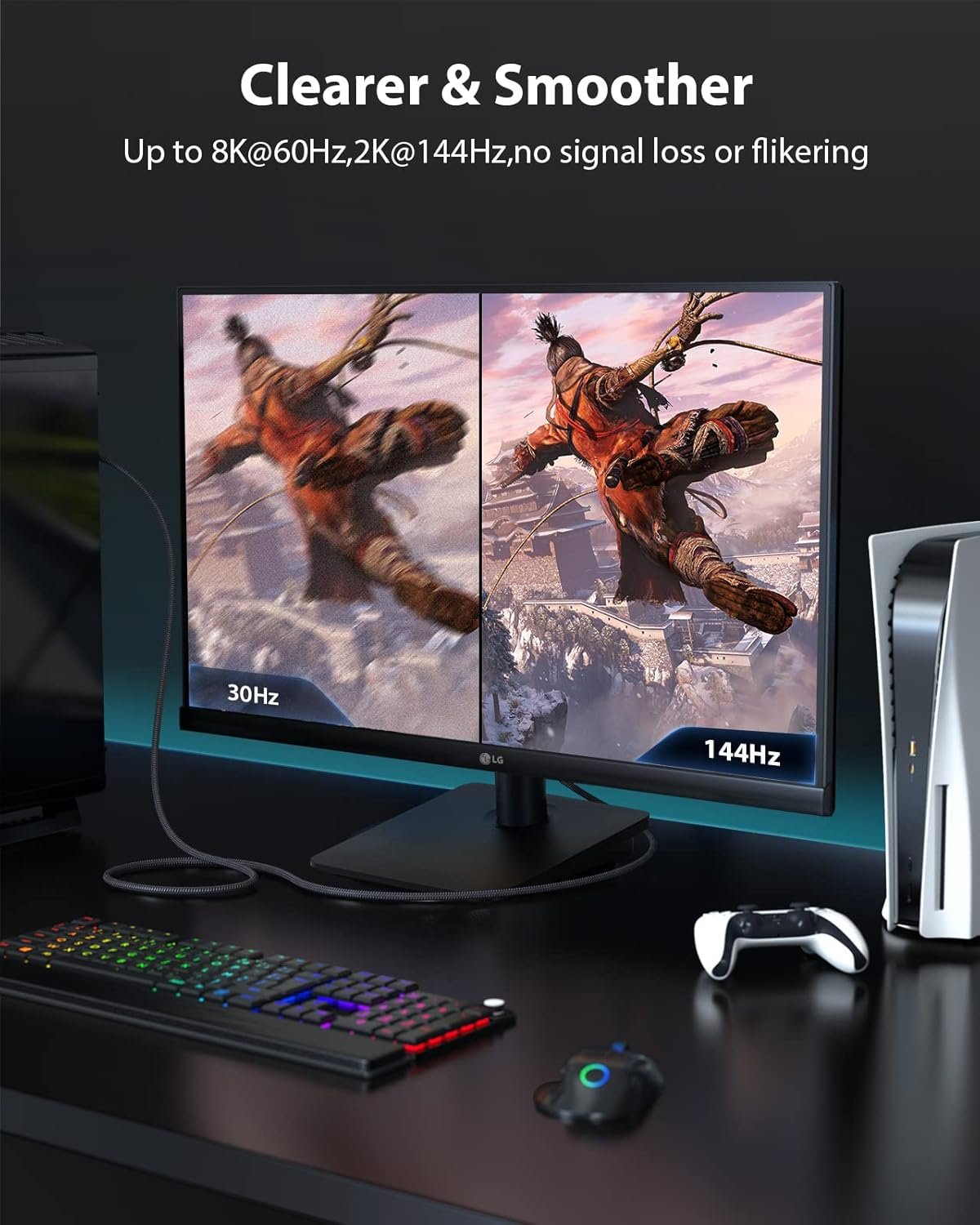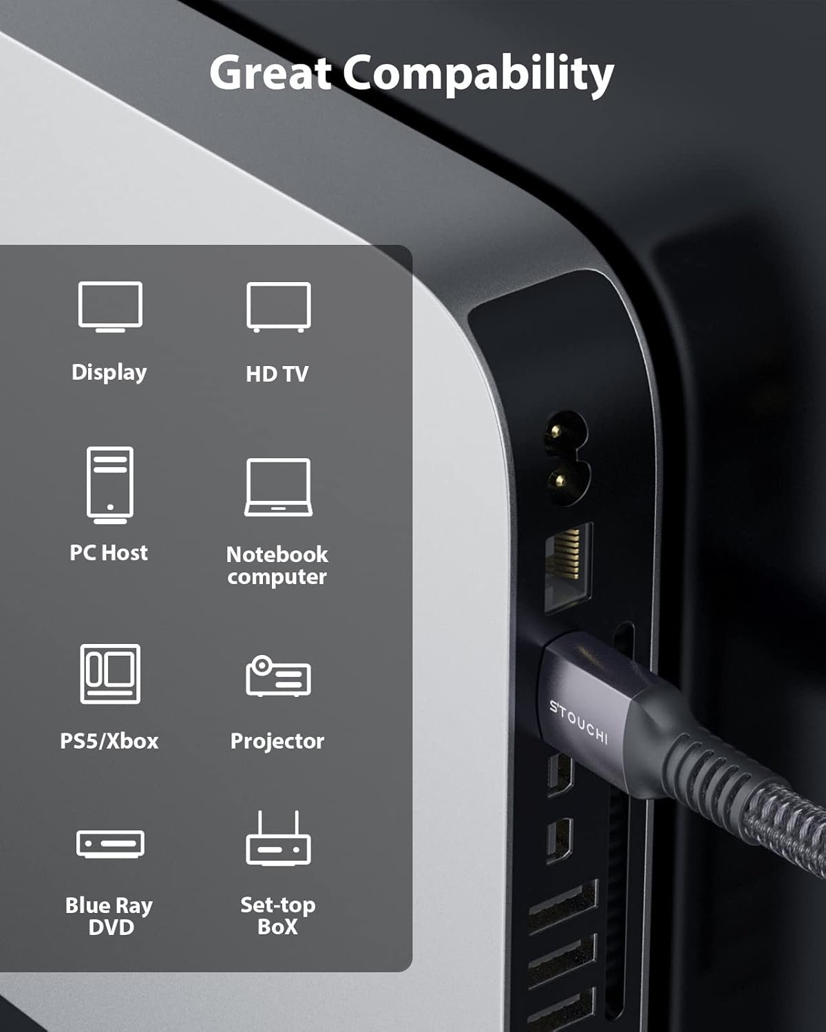 [8K@60Hz HDMI Cable]: Stouchi 8K HDMI 2.1 Lead supports 8K@60Hz, 4K@144Hz / 120Hz / 60Hz, a range of resolutions including 5K and 10K is supported, backwards compatible with HDMI 2.0b / 2.0a / 2.0 / 1.4 /1.3/1.2 /1.1 version. NOTICE: Make sure your devices support 8K.