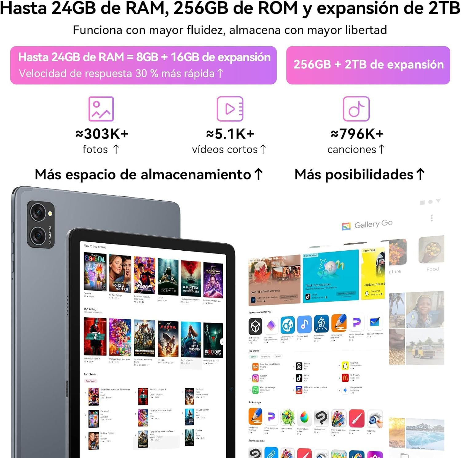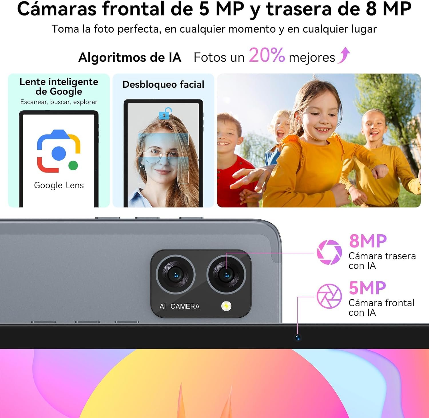 Dual AI Camera + Google Lens Smart Object Recognition: The TABWEE T20 tablet 256gb features an 8MP smart rear camera that allows you to easily capture detailed and authentic color landscapes and portraits. Scene optimization with AI lets you enhance photos of everything from food to sunsets to pets with a single touch. Its main feature, Google Lens, recognizes objects, text and landmarks in real time, making it incredibly convenient to translate, buy and search for information. Advanced facial recognition technology also allows instant and secure password free unlock.