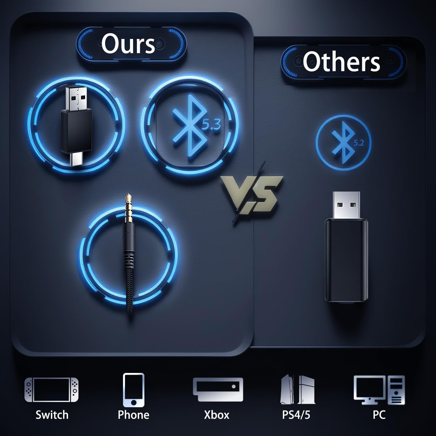 ❤【Compatible with Multiple Gaming Devices】The wireless headphones offer three connection options: Bluetooth + 2.4GHz USB transmitter + wired audio cable, ensuring wide compatibility. 2.4G 2 in 1 USB transmitter is suitable for PS4, PS5, PC, Switch and mobile devices; Bluetooth mode is suitable for mobile phones, Mac, laptops, etc.; 3.5mm wired mode