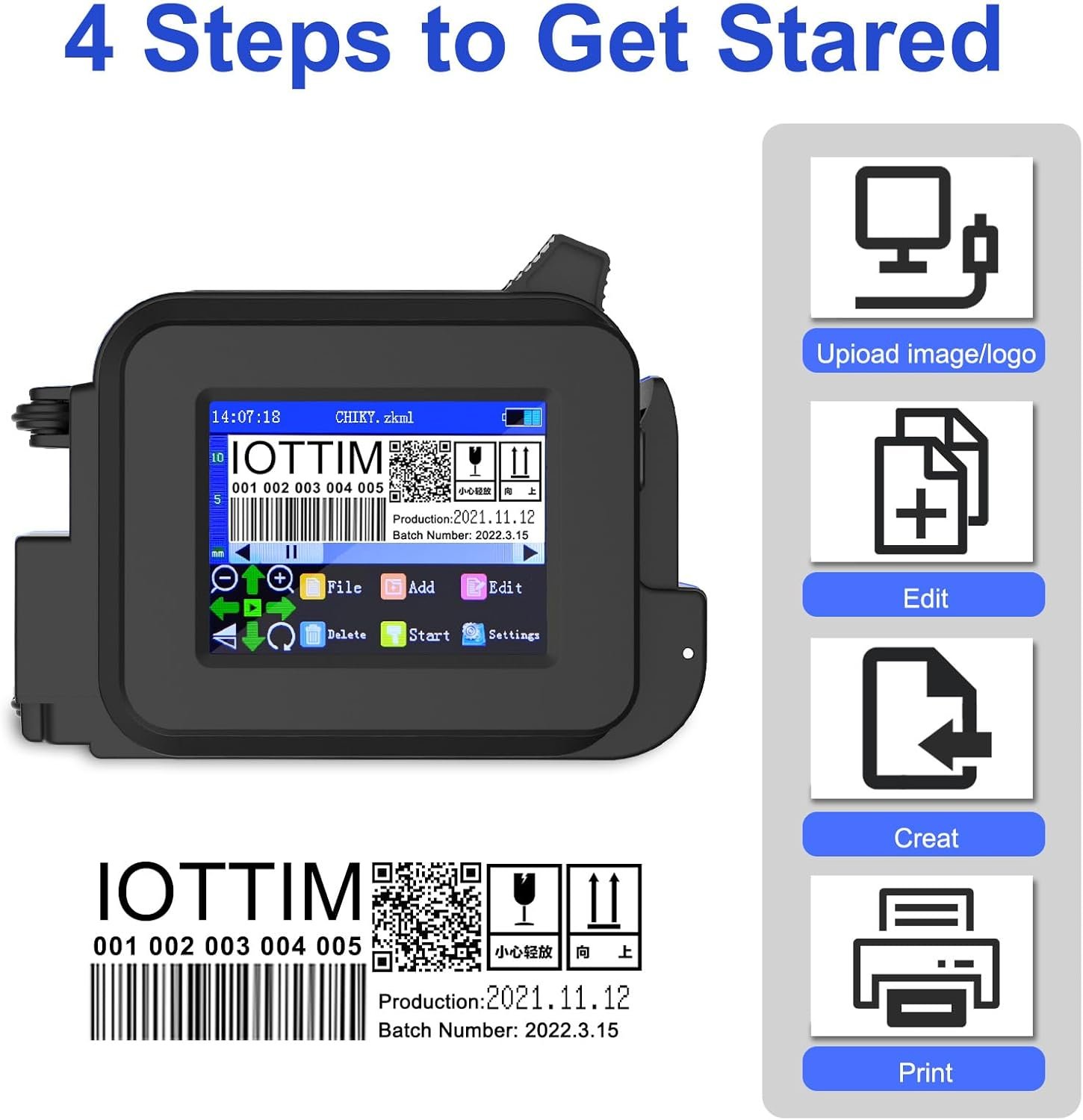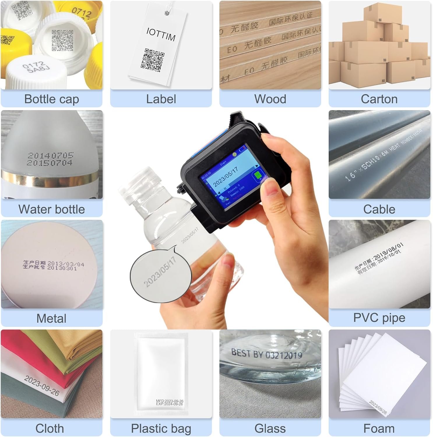 Print contet and material: text printing, label, nubers, QR code, barcode, production date, time, logos on the surface of paper, metal, glass, plastic, fabric, boards, cardboard, stone, pipe, cable, etc. directly. Comes with an alignment plate to pinpoint the location of contents, even uneven or even curved surfaces can be quick and effective.