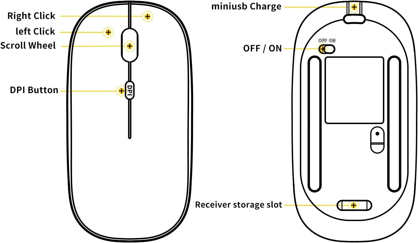 Rechargeable Wireless Mouse – Built-in lithium polymer batteries, high service life, easy to charge with micro USB cable (charge 1 hour to use 30 days), no more need for extra AAA batteries, never worry about the mouse running out of power.