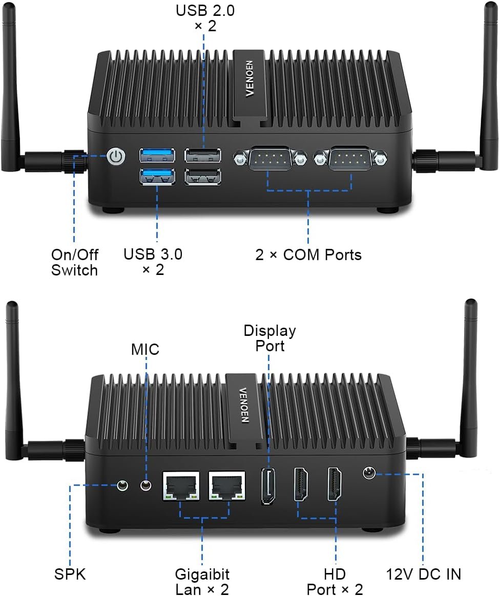 VENOEN N100 Win 11 Pro Fanless PC, Industrial Mini PC, 4K 60Hz, 2X HD2.0, DP1.2, RS232 COM, Dual LAN, USB, WiFi, BT4.2, Linux, Business/Home, PC Server, 8GB DDR4 RAM 256GB SSD