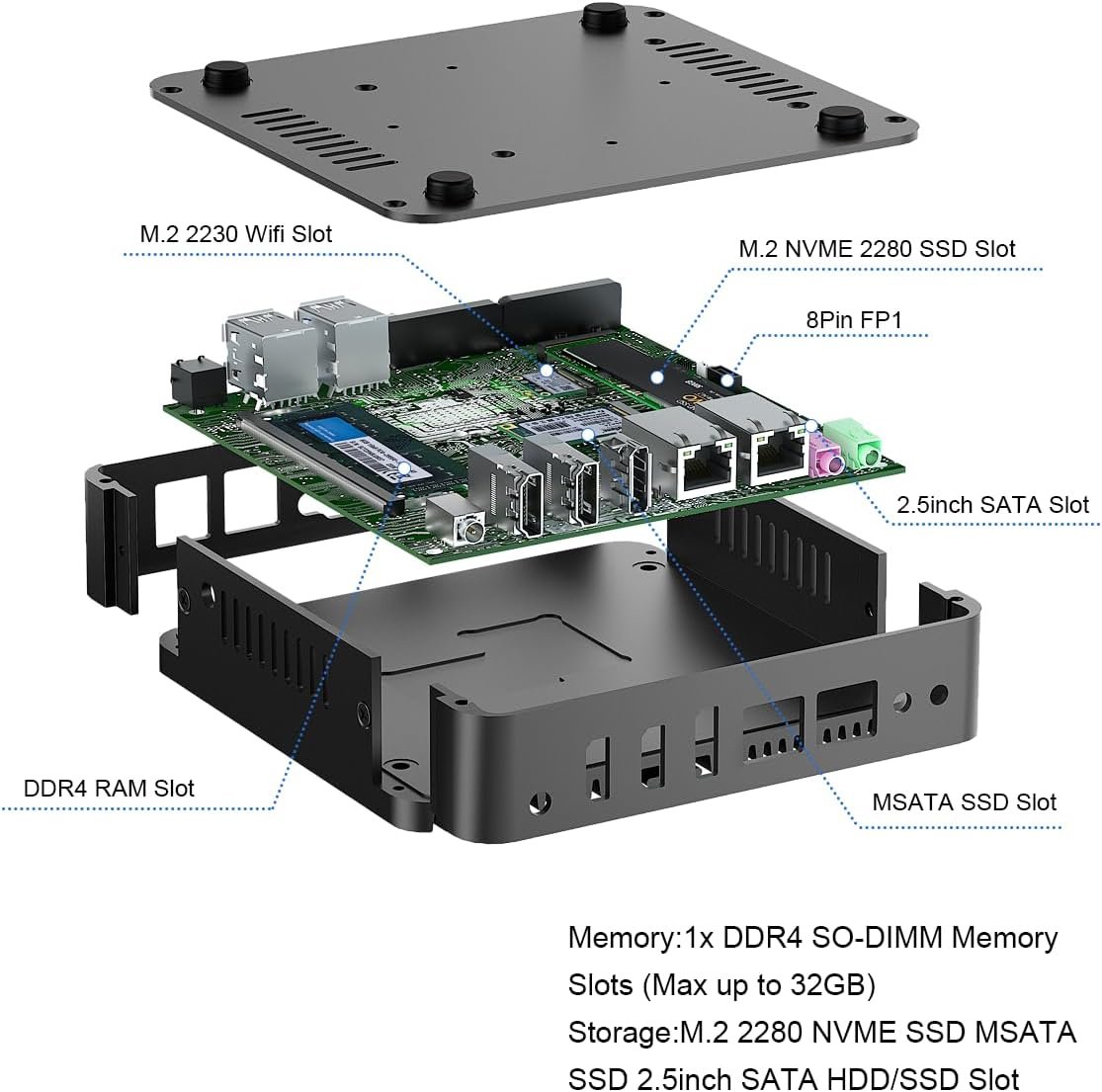 Memory: 1 x built-in DDR4 slots, Max 32GB DDR4 RAM