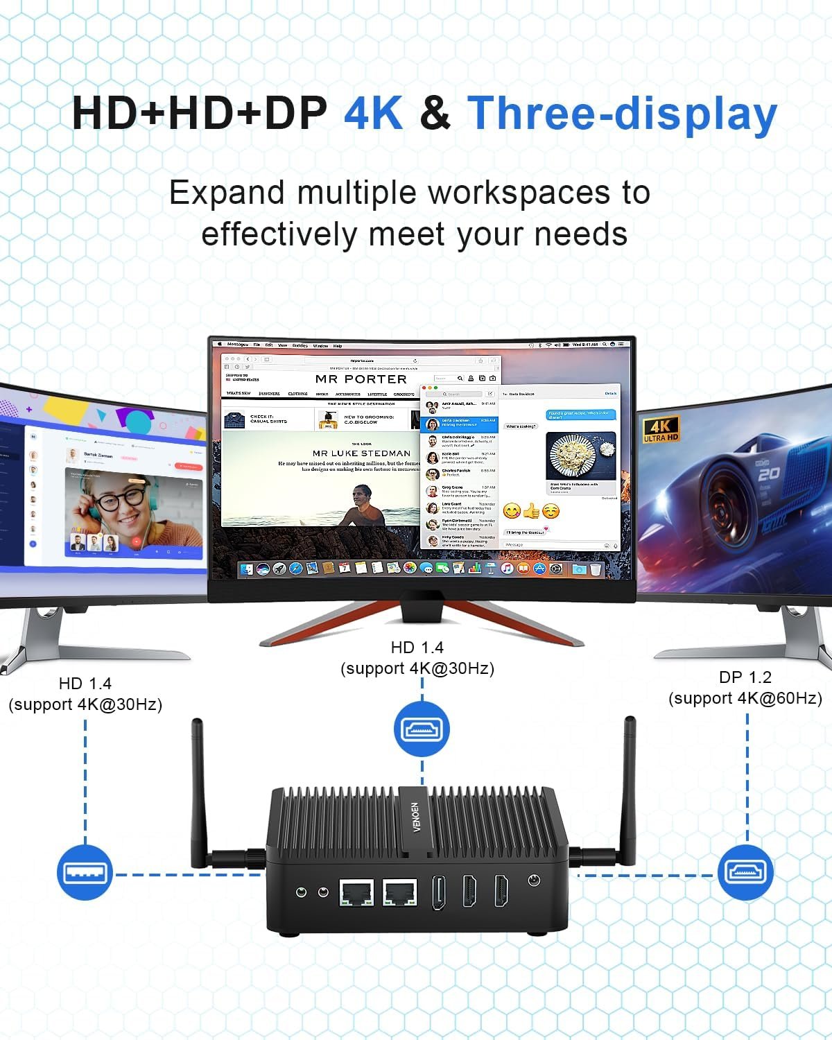 Display: 2 HD2.0 ports + 1 DP1.2 port, supports three monitors